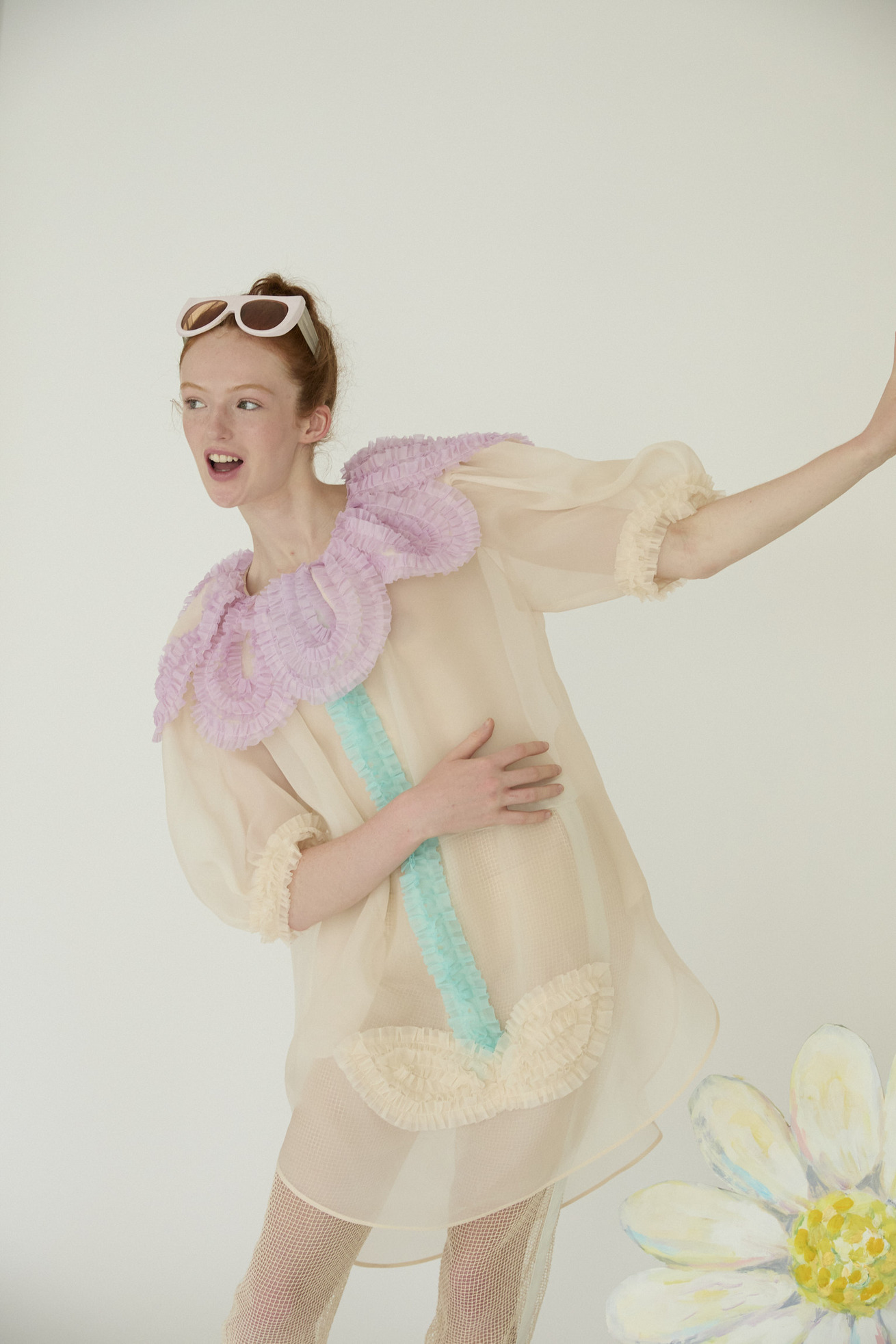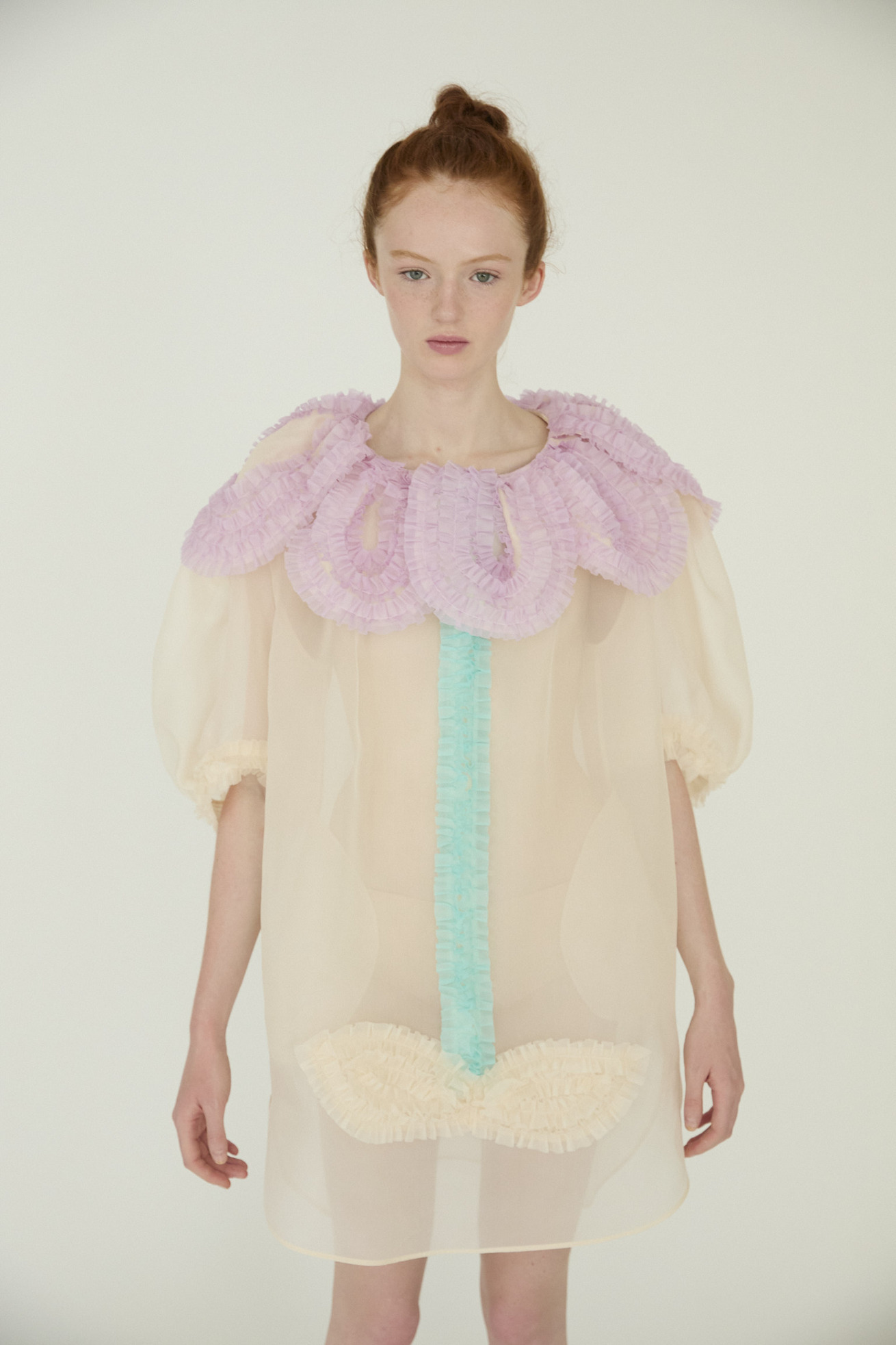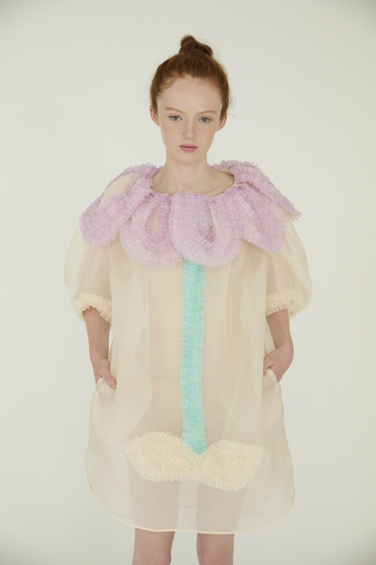 まるで大きな花を身に纏ったような、大きな花びらの襟と茎の前たてがキュートなデザインのワンピースです。 襟の大きな花びら、茎、葉の部分はフリルテープを使いボリュームと存在感のあるモチーフに。 ギャザーをたっぷり入れてふんわりと丸いシルエットをつくる袖のラインもポイントです。 シルクオーガンジーの光沢感と透け感が、ファンシーでより特別感のある1枚にしています。 インナーワンピース付き。 ケア方法:ドライクリーニング ※着用モデル身長:176cm ※着用サイズ: 2(M)