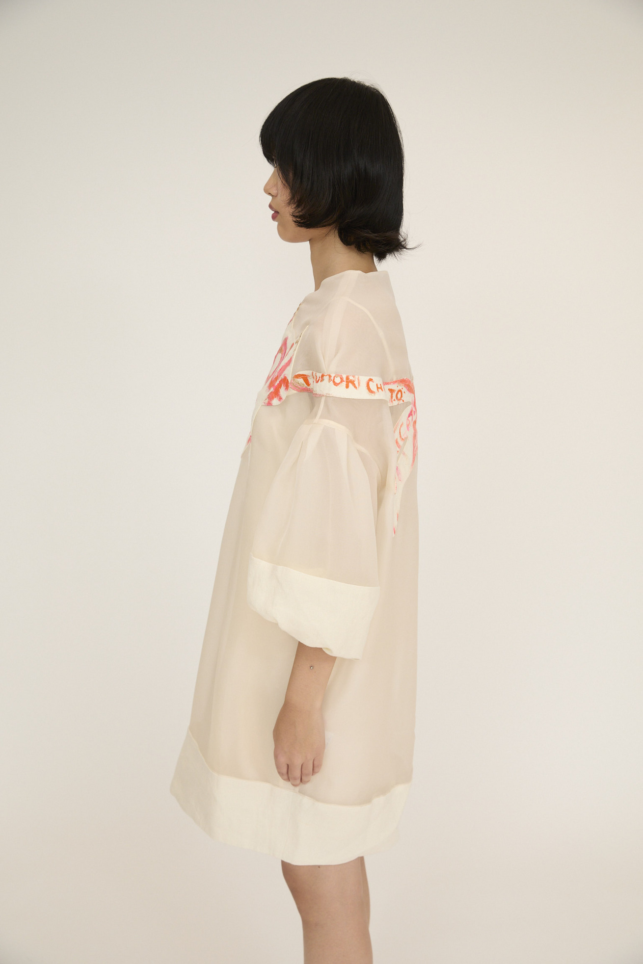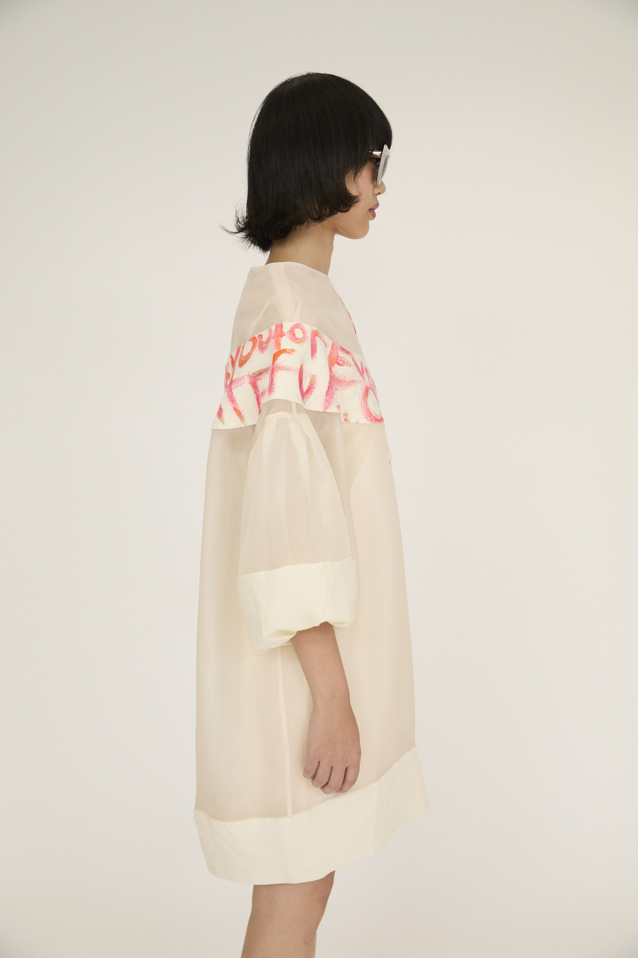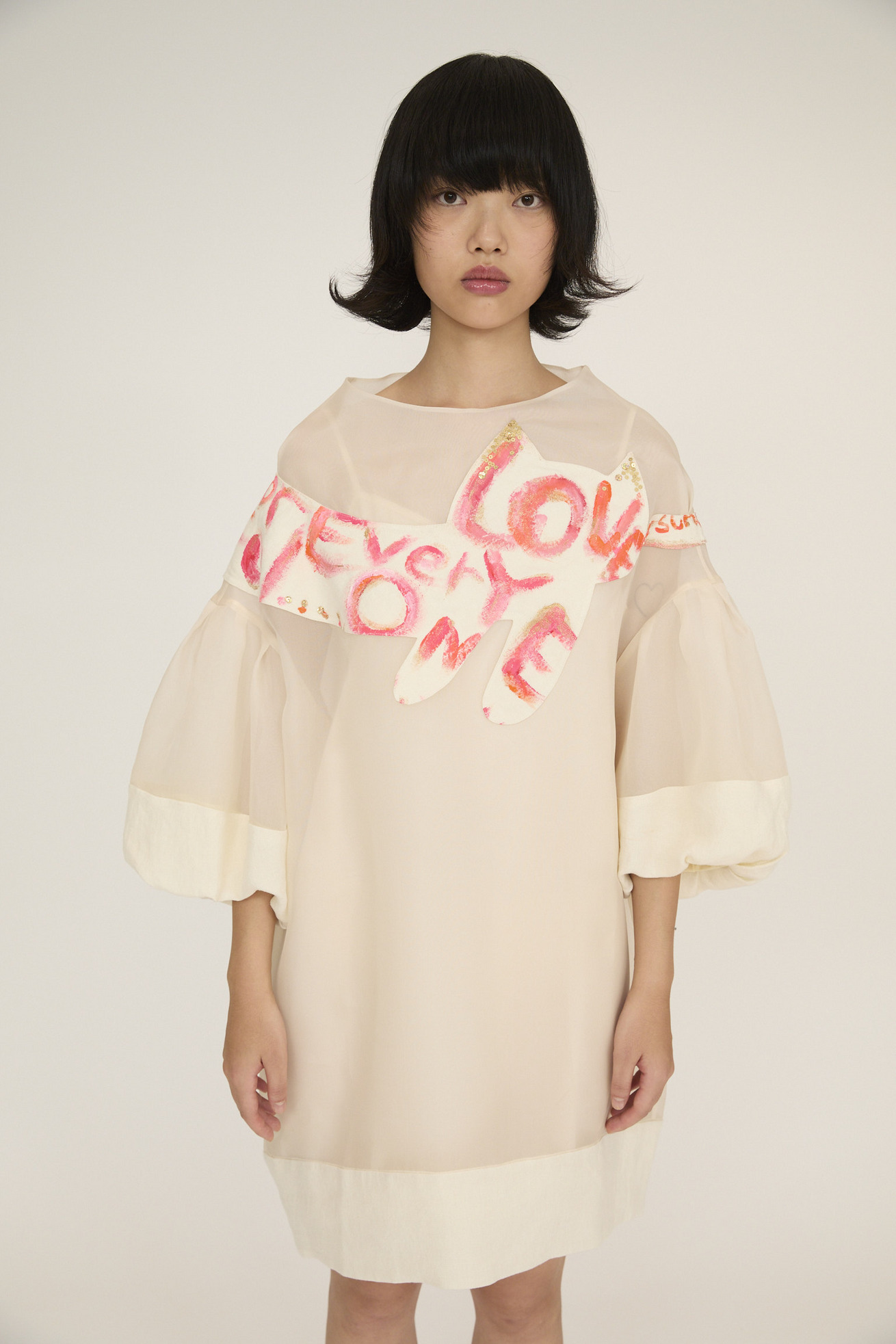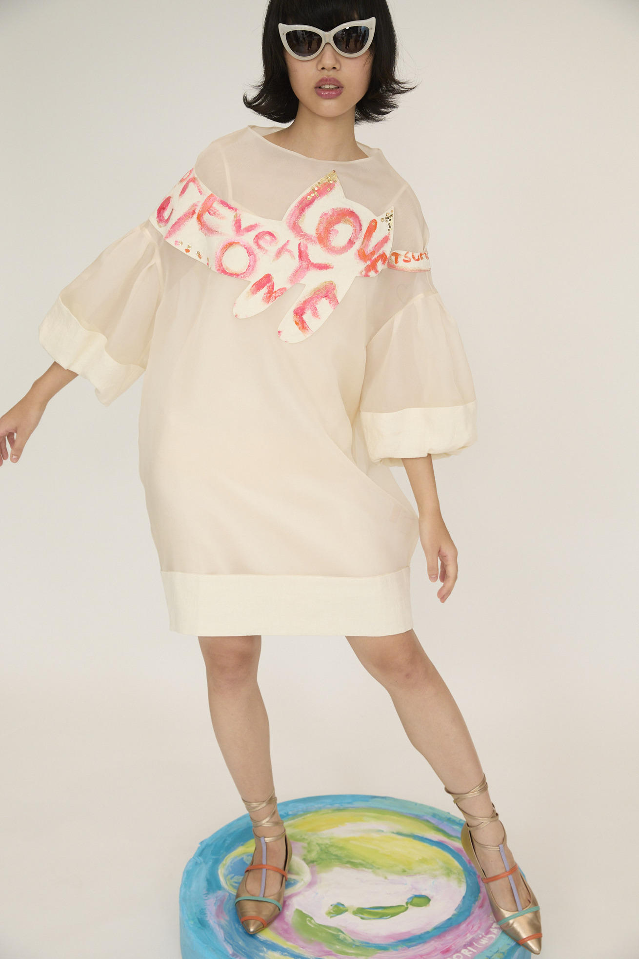 ボリューム感のある大きな丸い袖、やわらかい丸みのあるシルエットが特徴のチュニックワンピース。 シルクオーガンジーならではの光沢とハリ感が上品なアイテムです。 フロントには、MessageprintをTSUMORICHISATOのアイコンであるキラネコの形にのせてアクセントに。 インナーワンピース付き 【Messageprint】 I’mgratefulforeverything.I’mgratefulfor… 沢山の色を使って綴った、感謝のメッセージで埋めつくしたテキスタイル。 ケア方法:ドライクリーニング ※着用モデル身長:174cm ※着用サイズ:2(M)