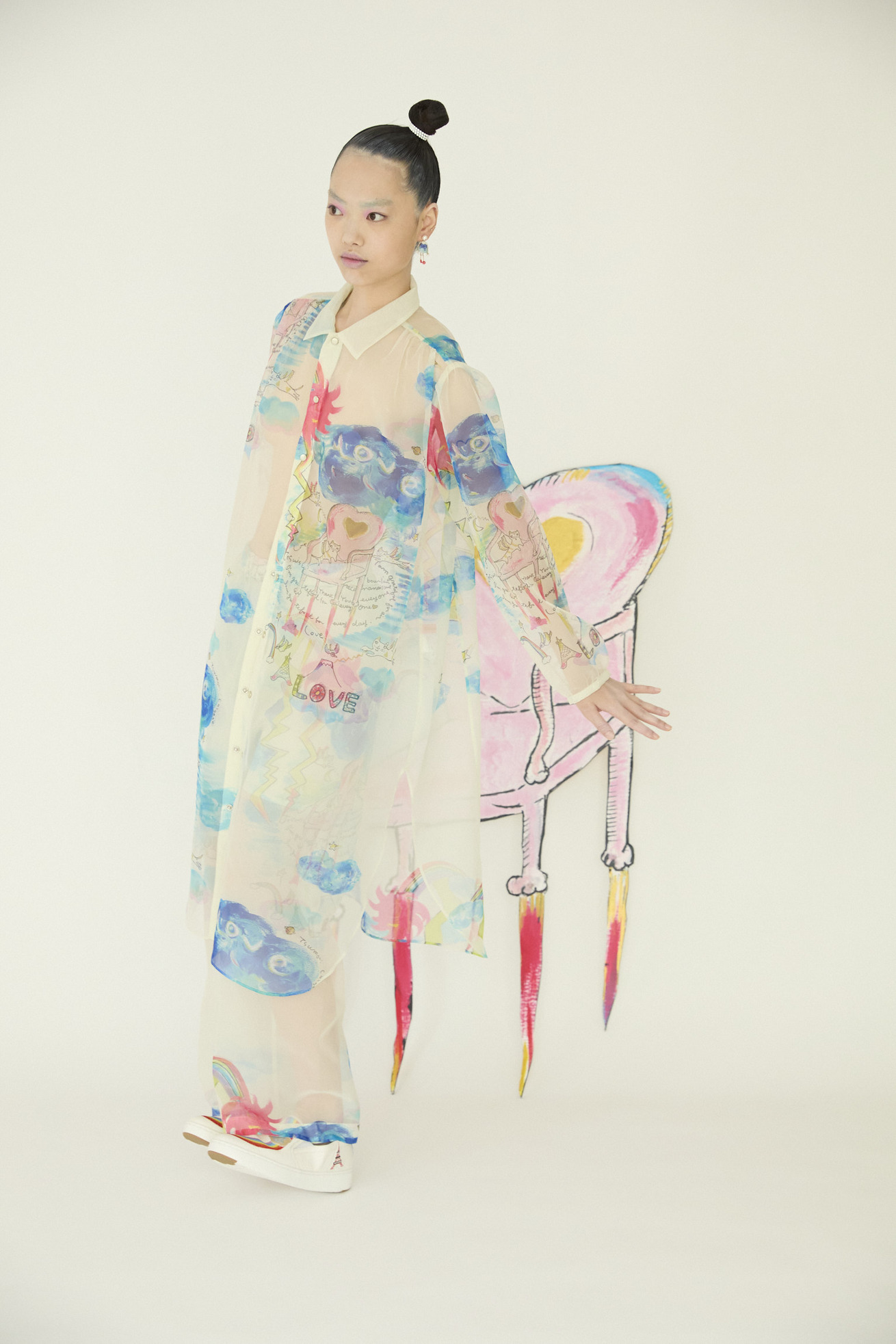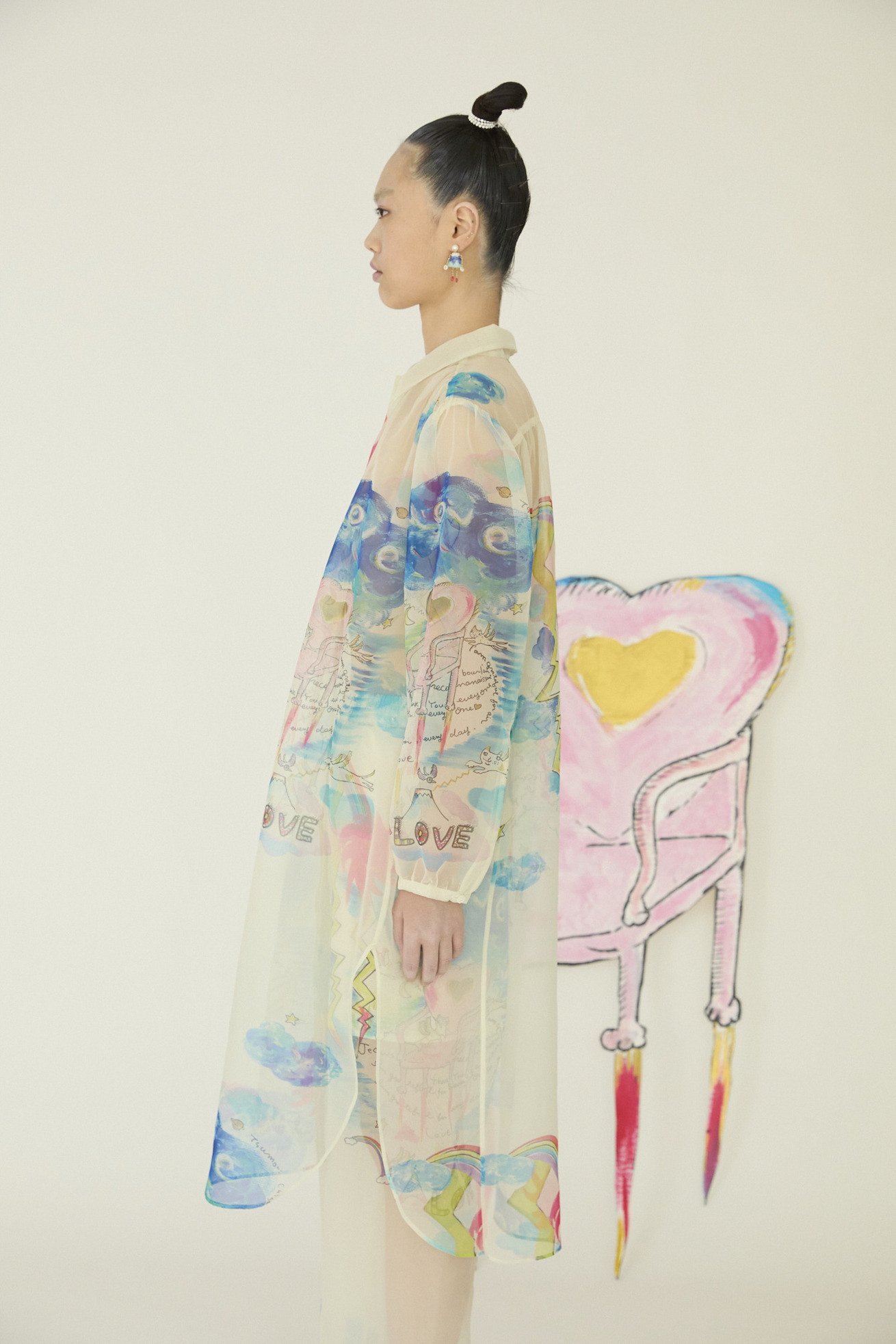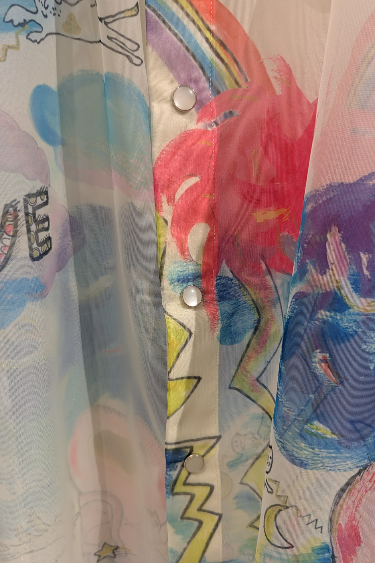 Cat's chair organdyの総柄シャツワンピース。 ゆったしとしたサイズ感で、サイドには深めのスリットが入り、ボトムとのコーディネートもバランスが取りやすくなっています。 スナップボタンで着脱しやすく、羽織りとしてもご利用いただけす。 オーガンジーならではの透け感、上品でやさしいプリントの雰囲気をお楽しみください。 ※インナーワンピースは付いておりません。 【Cat's chair organdy】 富士山や東京タワーのさらに高い空の上。たくさんの雲とお日様、虹から光るイナヅマ。 空飛ぶAngel catたちはハート型の椅子に駆け寄ったり座ったり。手書きで綴った感謝のメッセージも。 リサイクル素材のポリエステルオーガンジーに、筆のタッチをそのまま京都で転写プリントしています。 ケア方法:手洗い可能 ※着用モデル身長:174cm ※着用サイズ: 2(M)