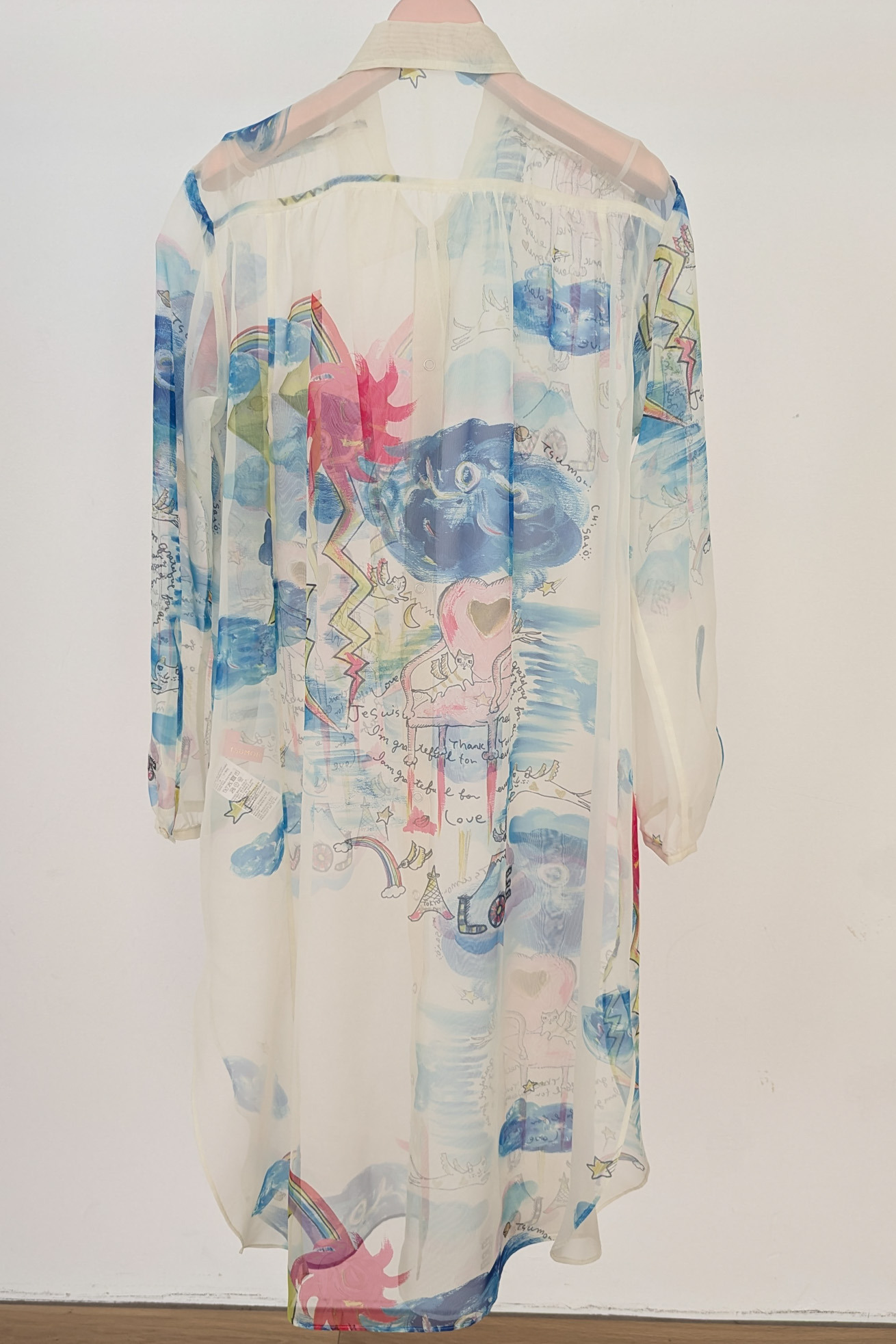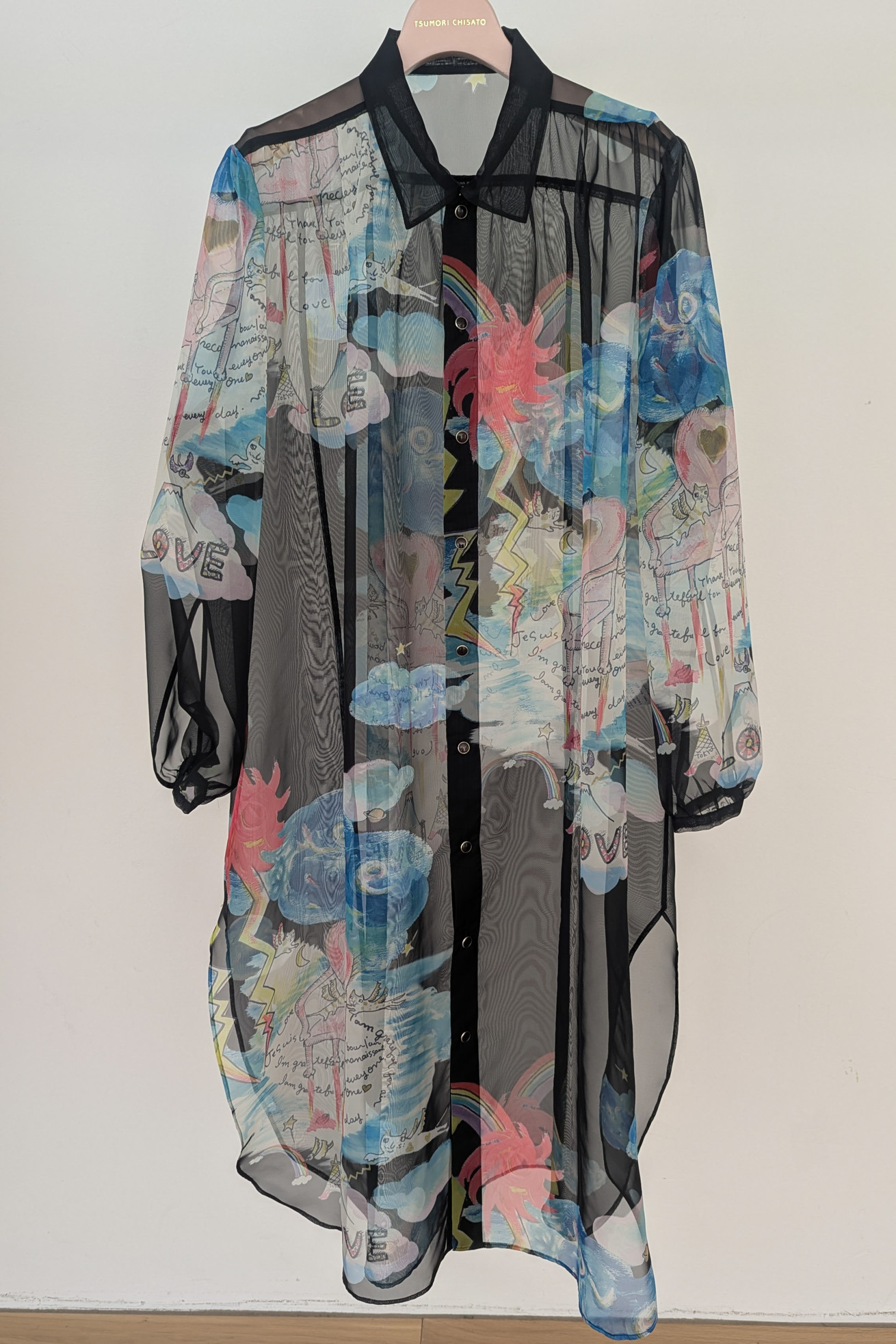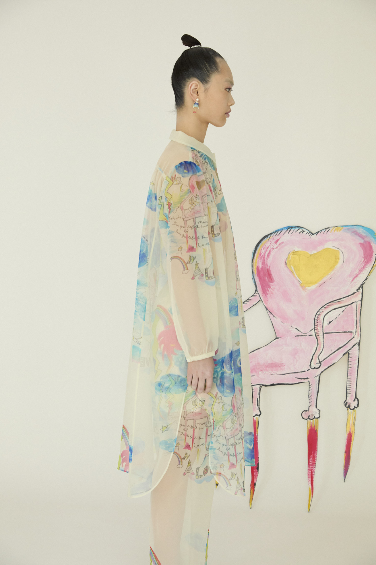 Cat's chair organdyの総柄シャツワンピース。 ゆったしとしたサイズ感で、サイドには深めのスリットが入り、ボトムとのコーディネートもバランスが取りやすくなっています。 スナップボタンで着脱しやすく、羽織りとしてもご利用いただけす。 オーガンジーならではの透け感、上品でやさしいプリントの雰囲気をお楽しみください。 ※インナーワンピースは付いておりません。 【Cat's chair organdy】 富士山や東京タワーのさらに高い空の上。たくさんの雲とお日様、虹から光るイナヅマ。 空飛ぶAngel catたちはハート型の椅子に駆け寄ったり座ったり。手書きで綴った感謝のメッセージも。 リサイクル素材のポリエステルオーガンジーに、筆のタッチをそのまま京都で転写プリントしています。 ケア方法:手洗い可能 ※着用モデル身長:174cm ※着用サイズ: 2(M)