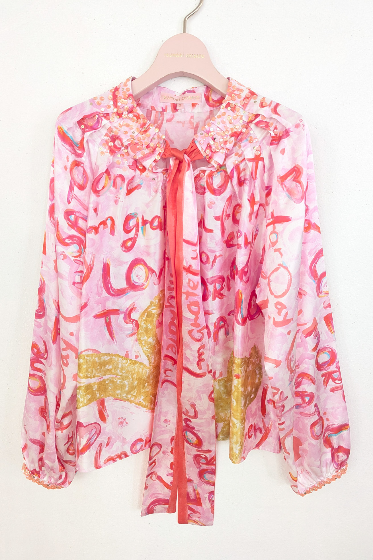 Messageprintの総柄ボウタイブラウスです。 襟元にタックを入れることで上品で丸くコンパクトな形をつくっています。 シルクサテンの光沢感と、襟元や袖口にスパンコールをプラスし華やかな1枚に仕上げています。 配色の大きなリボンもポイントです。 【Messageprint】 I’mgratefulforeverything.I’mgratefulfor… 沢山の色を使って綴った、感謝のメッセージで埋めつくしたテキスタイル。 TSUMORICHISATOのアイコン、筆タッチの大きなキラネコもポイントです。 柔らかく光沢感のあるシルクサテンに中国でインクジェットプリントをしています。 ケア方法:ドライクリーニング ※着用モデル身長:174cm ※着用サイズ:2(M)