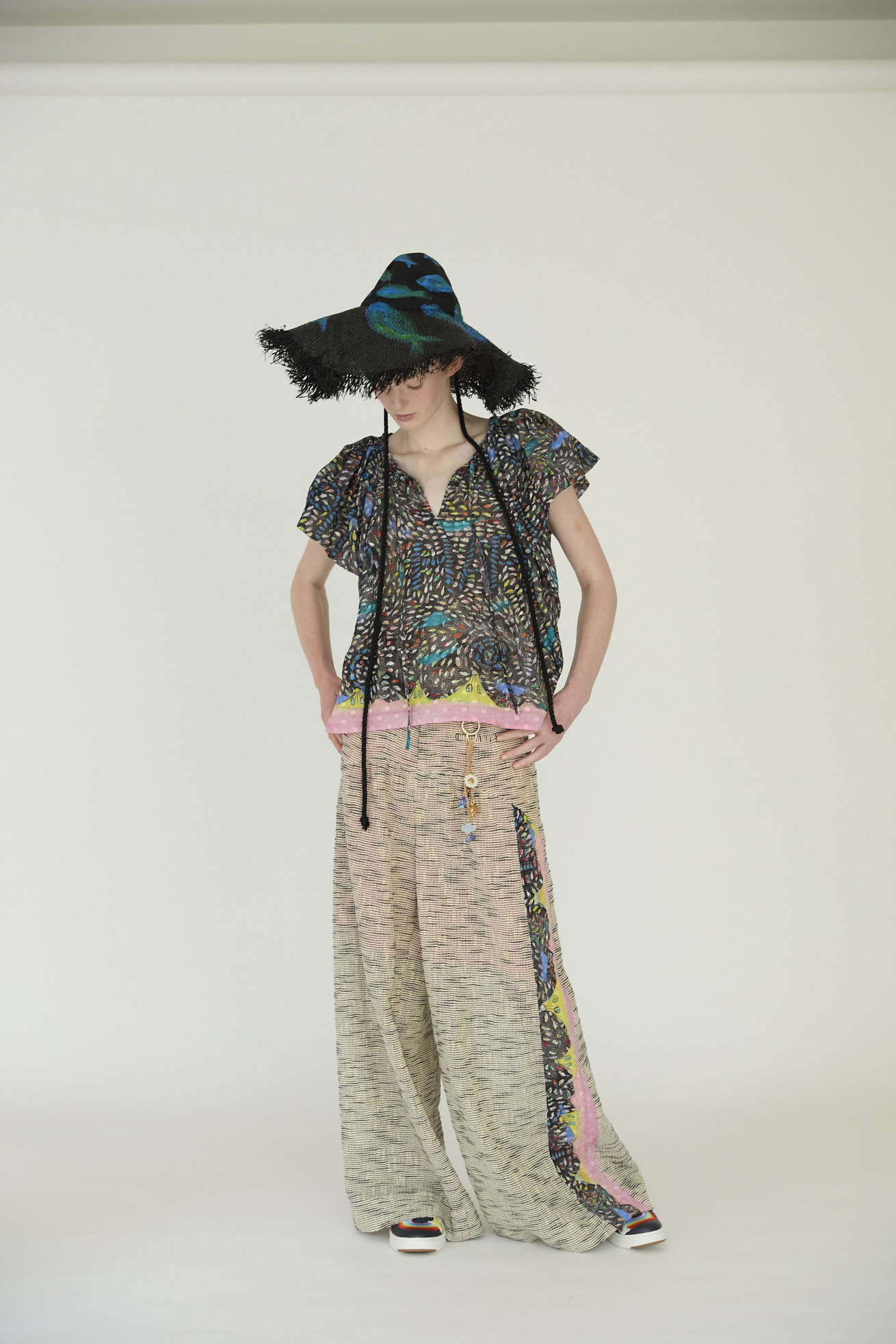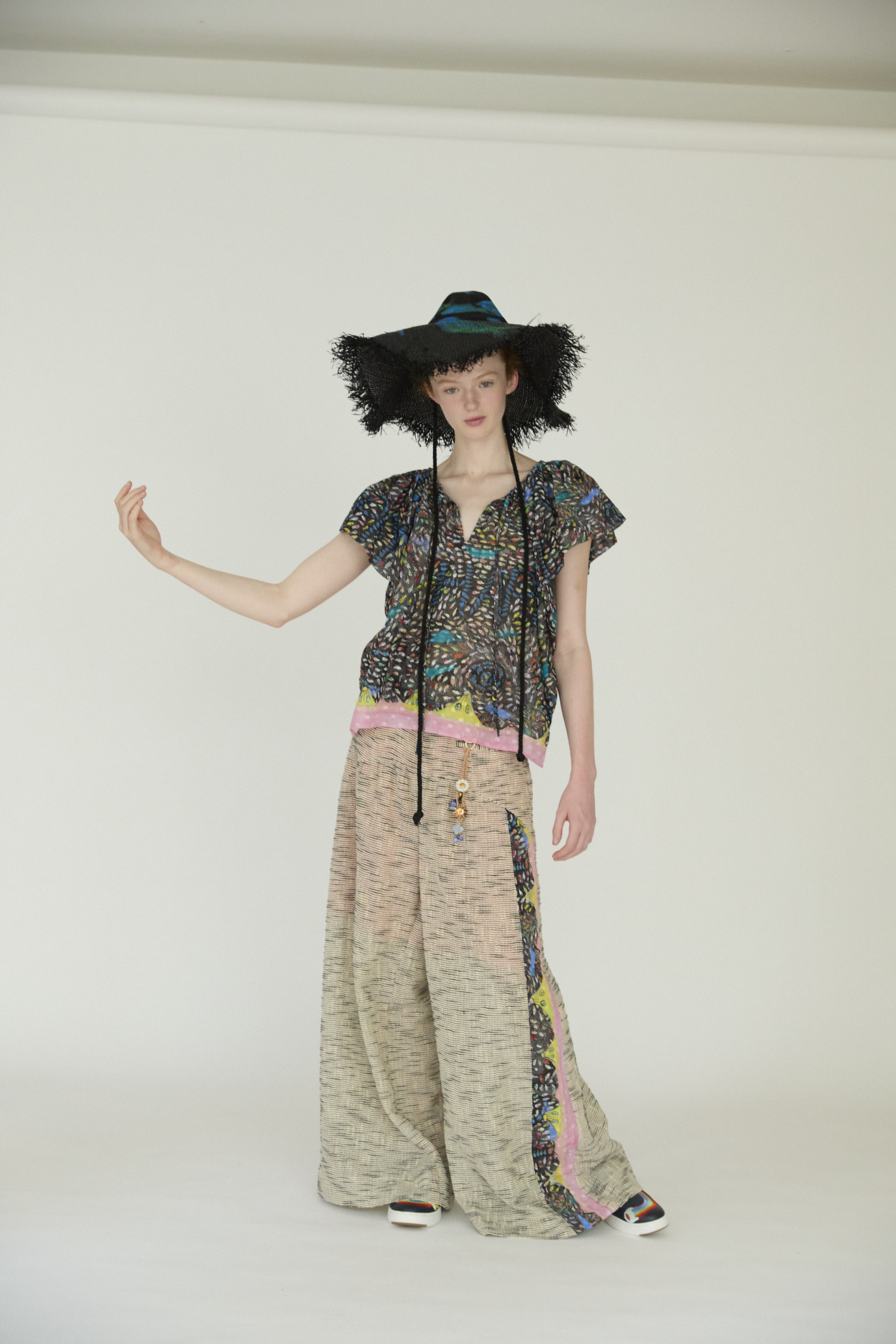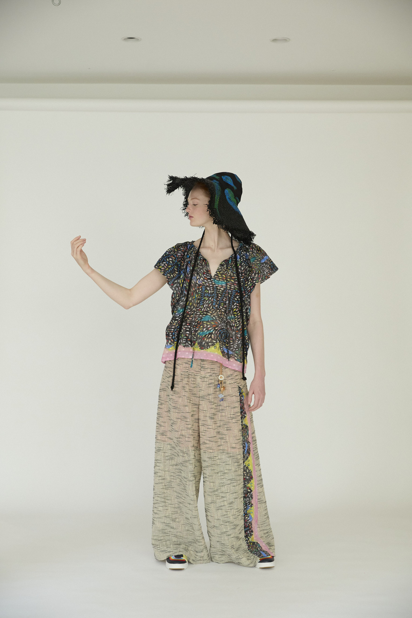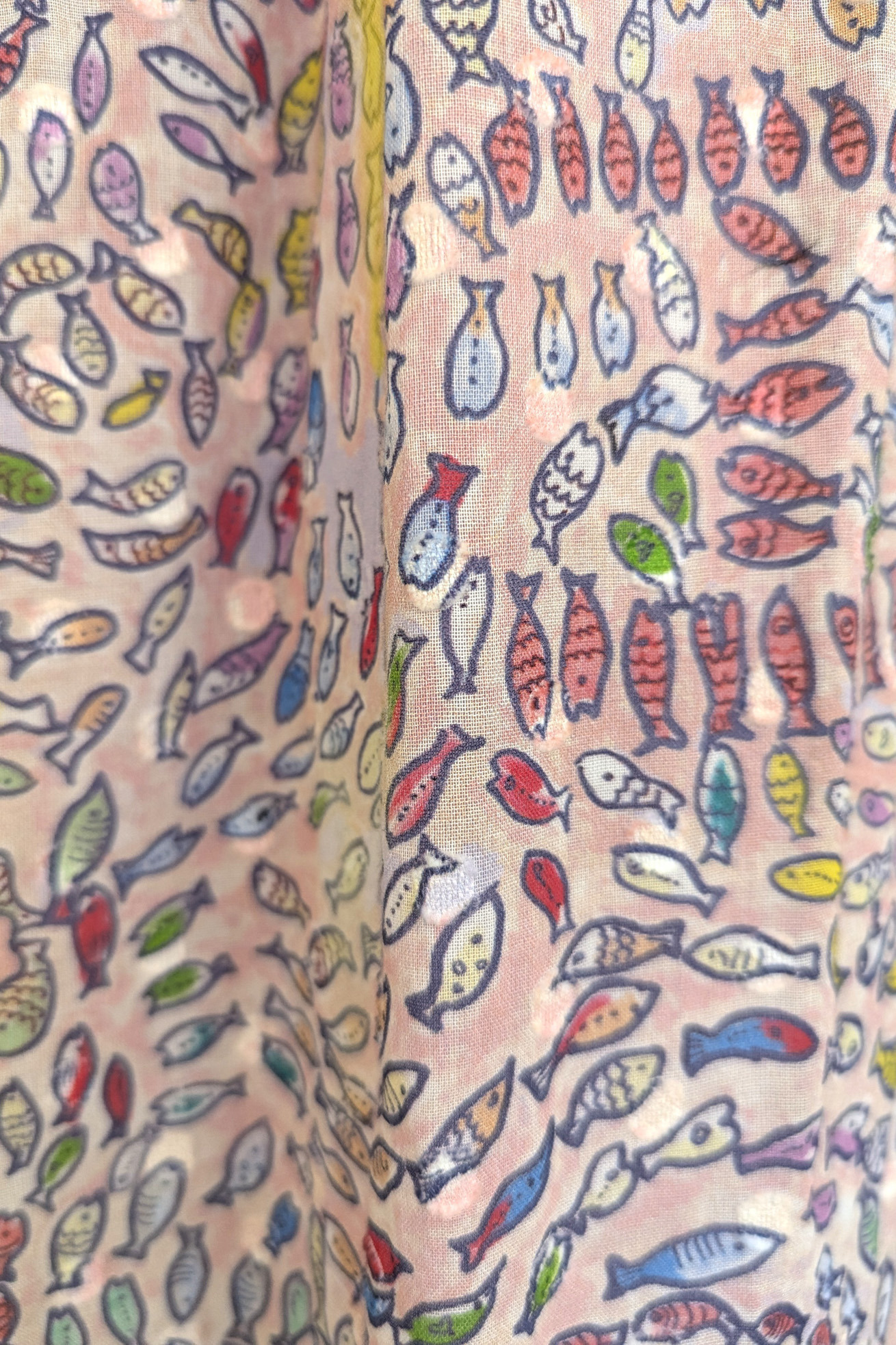 コットン100%のDancing fish parade生地をたっぷり使用したブラウス。 袖部分はギャザーと生地を二重にすることでふんわりとボリュームのあるシルエットに。 アームホールが広すぎず、インナーを気にせず着用できます。 軽い着心地と立体的なラインが特徴のアイテムです。首もとの開きは紐で調整が可能です。 【Dancing fish parade】 カラフルな魚たちが踊るように泳ぐ海の中。小さな魚たちが集まって作るLOVEやHAPPY、ネコ型やハート型が楽しいテキスタイルです。 1匹1匹丁寧なタッチで描かれ、よく見るといろんな表情の魚たちを見つけられる一枚です。カラーコンビネーションにもこだわりました。 少し透け感がある、肌触りの良いコットンの水玉カットジャカード生地に京都でインクジェットプリントをしています。 ケア方法:手洗い可能 ※着用モデル身長:176cm ※着用サイズ: 2(M)