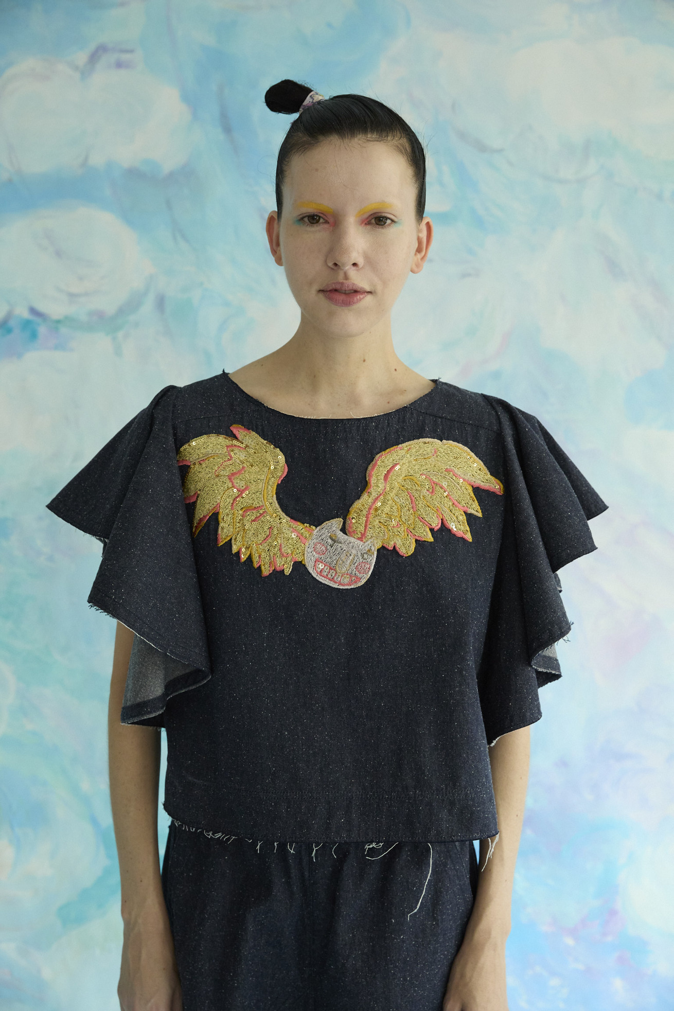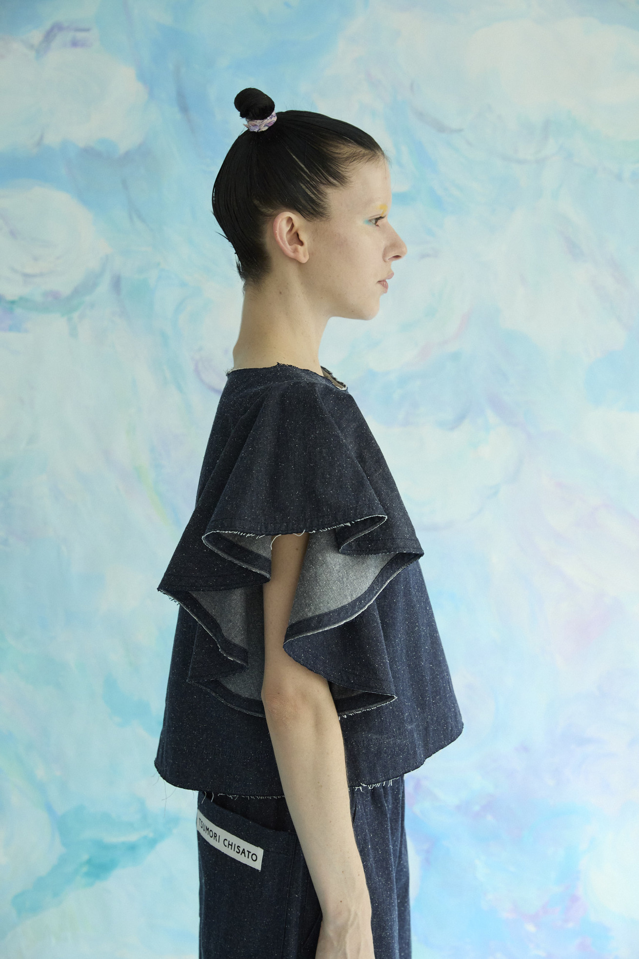 大きなフレアスリーブが特徴のコンパクト丈ブラウス。ほど良いハリ感のある生地が袖のラインをキレイにつくっています。 襟ぐり、袖、裾はあえて切りっぱなしにすることでカジュアルに、ボトムとのセットアップもおすすめです。 存在感のある胸元のモチーフは、翼を持ち、白い歯を出して笑うファニーフェイスなCat Angel。 まるで手縫いでざくざくと刺繍をしたような立体的な手法で刺繍をしました。 「T」と「C」の目やキラキラ光るスパンコールもポイントです。 凹凸感とネップが特徴の生地は、シルクの糸を紡績する際に出てしまう繊維クズ(ブーレットノイル)を使用したデニム素材。 中肉でしっかりとしたハリコシと、ブーレットノイル特有の素材感が、ざっくりとナチュラルな表情の味わい深さを持っています。 刺繍は徳島県でしています。 ケア方法:ドライクリーニング ※着用モデル身長:173cm ※着用サイズ: 2(M)
