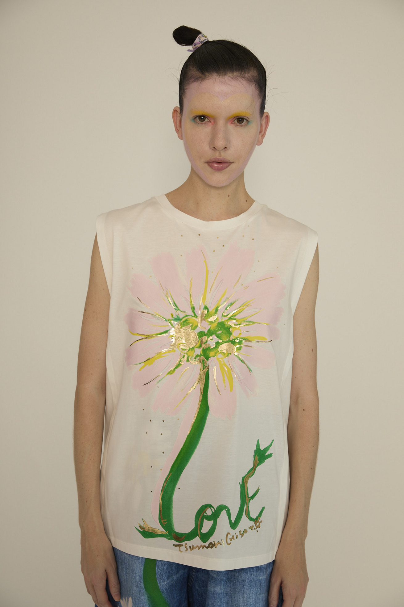 葉っぱ部分がLoveの文字になっている、ダイナミックなデイジーが存在感のあるタンクトップ。 箔プリントと、全体に少し厚みを持たせたプリントがポイントで、京都でハンドプリントをしています。 接触冷感性があり、毛羽が少なくシルクのような光沢のコットン天竺を使用し、なめらかで着心地の良いアイテムに仕上げました。 スッキリとしたシンプルなデザイン、脇が開きすぎず1枚でもインナーとしても便利な1枚です。 ケア方法:手洗い可能 ※着用モデル身長:173cm ※着用サイズ: 2(M)