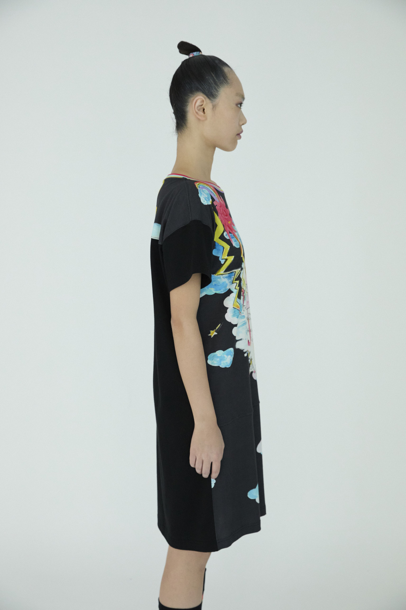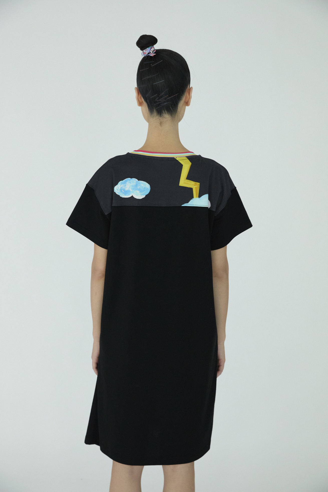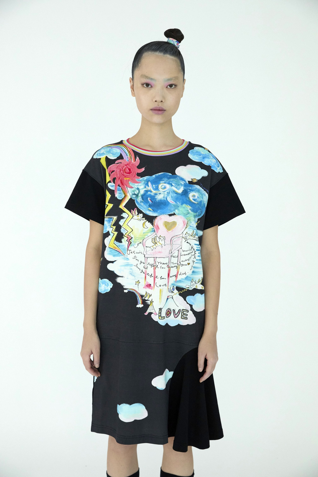 Cat's Chairプリントを前身頃とヨークに使用し、無地をミックスさせたTシャツワンピース。 左裾の切り替えデザイン、虹をイメージした配色の襟ぐりもポイントです。 カジュアルに着やすく、縦のラインがスッキリとした印象のアイテムです。 生地はナイル川流域で生産されるエジプト超長綿“GIZA”をベースにしたブレンド綿を使用した天竺で、コットンながらも上品な光沢感や柔らかい風合いが特徴です。 京都でインクジェットプリントをしています。 【Cat's Chair T】 富士山や東京タワーのさらに高い空の上。たくさんの雲とお日様、虹から光るイナヅマ。空飛ぶAngel catたちはハート型の椅子に駆け寄ったり座ったり、かわいい表情をしています。 手書きで綴った感謝のメッセージもポイントです。 ケア方法:手洗い可能 ※着用モデル身長:02:off white 173cm 26:black 174cm ※着用サイズ: 2(M)