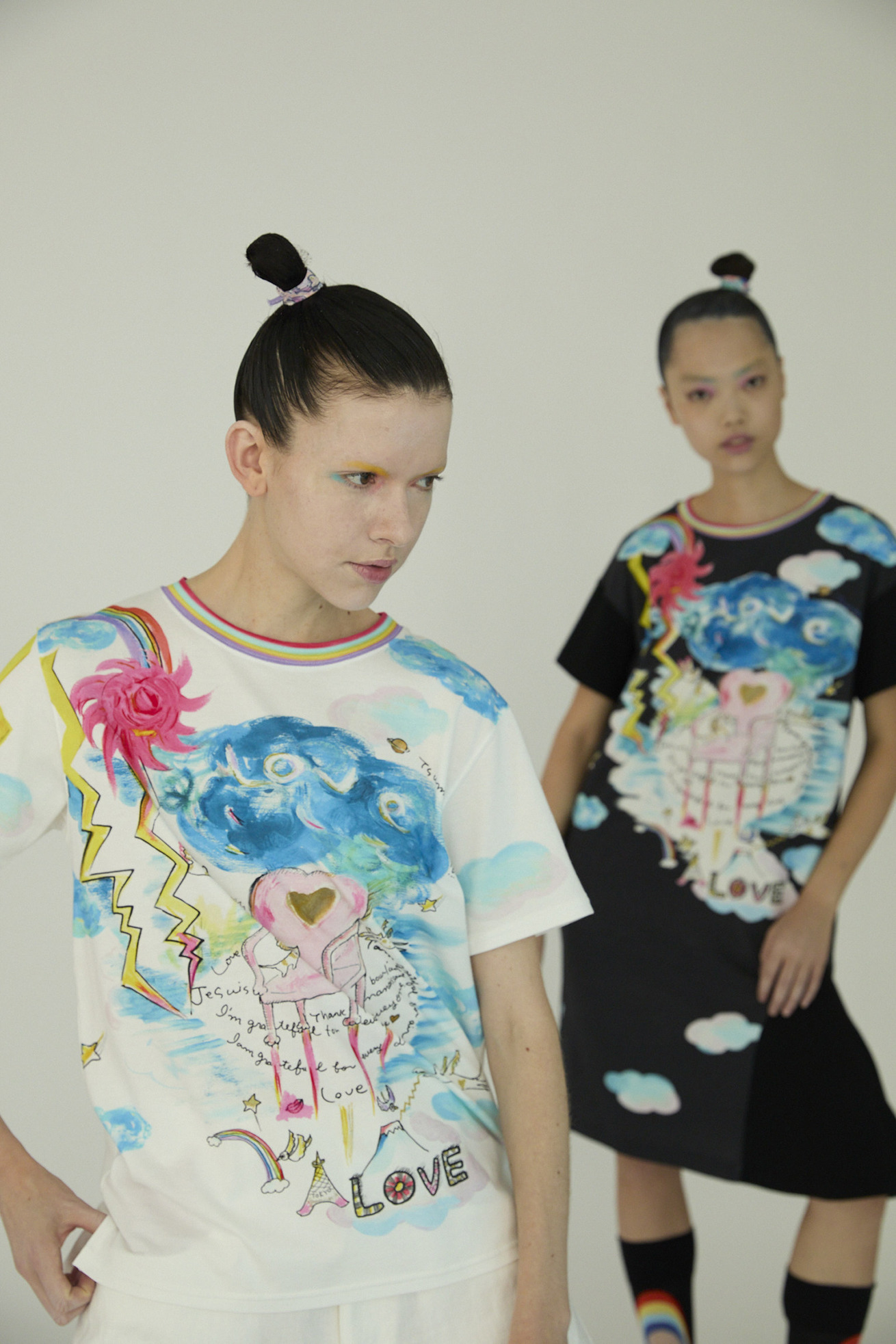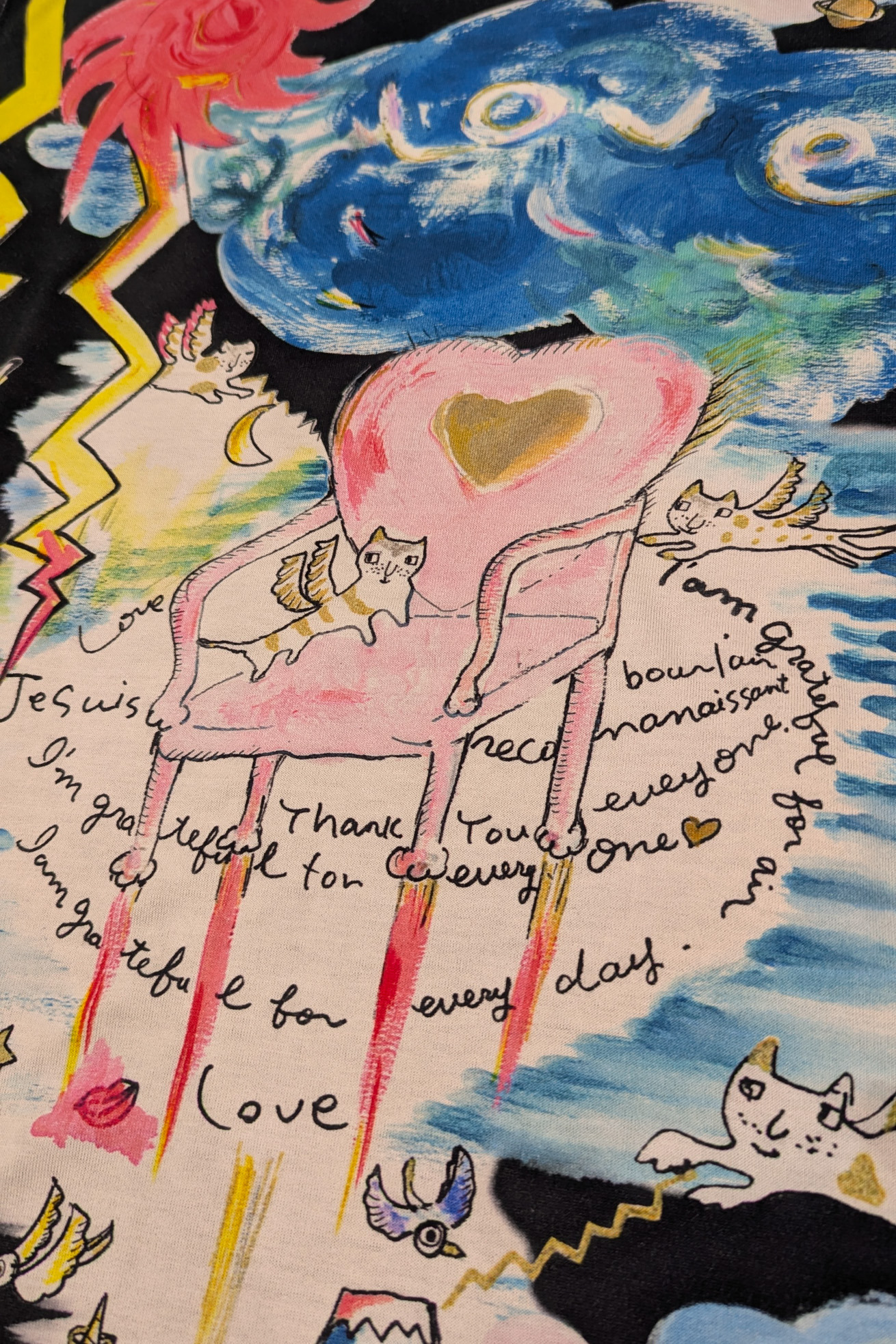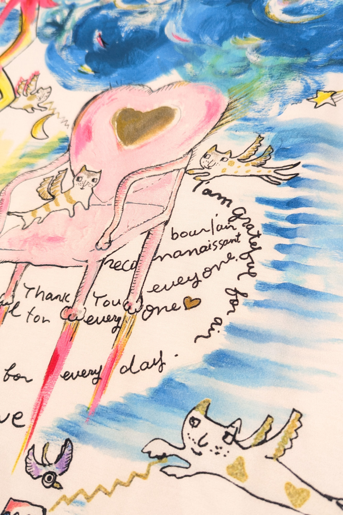 Cat's Chairプリントを前身頃とヨークに使用し、無地をミックスさせたTシャツワンピース。 左裾の切り替えデザイン、虹をイメージした配色の襟ぐりもポイントです。 カジュアルに着やすく、縦のラインがスッキリとした印象のアイテムです。 生地はナイル川流域で生産されるエジプト超長綿“GIZA”をベースにしたブレンド綿を使用した天竺で、コットンながらも上品な光沢感や柔らかい風合いが特徴です。 京都でインクジェットプリントをしています。 【Cat's Chair T】 富士山や東京タワーのさらに高い空の上。たくさんの雲とお日様、虹から光るイナヅマ。空飛ぶAngel catたちはハート型の椅子に駆け寄ったり座ったり、かわいい表情をしています。 手書きで綴った感謝のメッセージもポイントです。 ケア方法:手洗い可能 ※着用モデル身長:02:off white 173cm 26:black 174cm ※着用サイズ: 2(M)