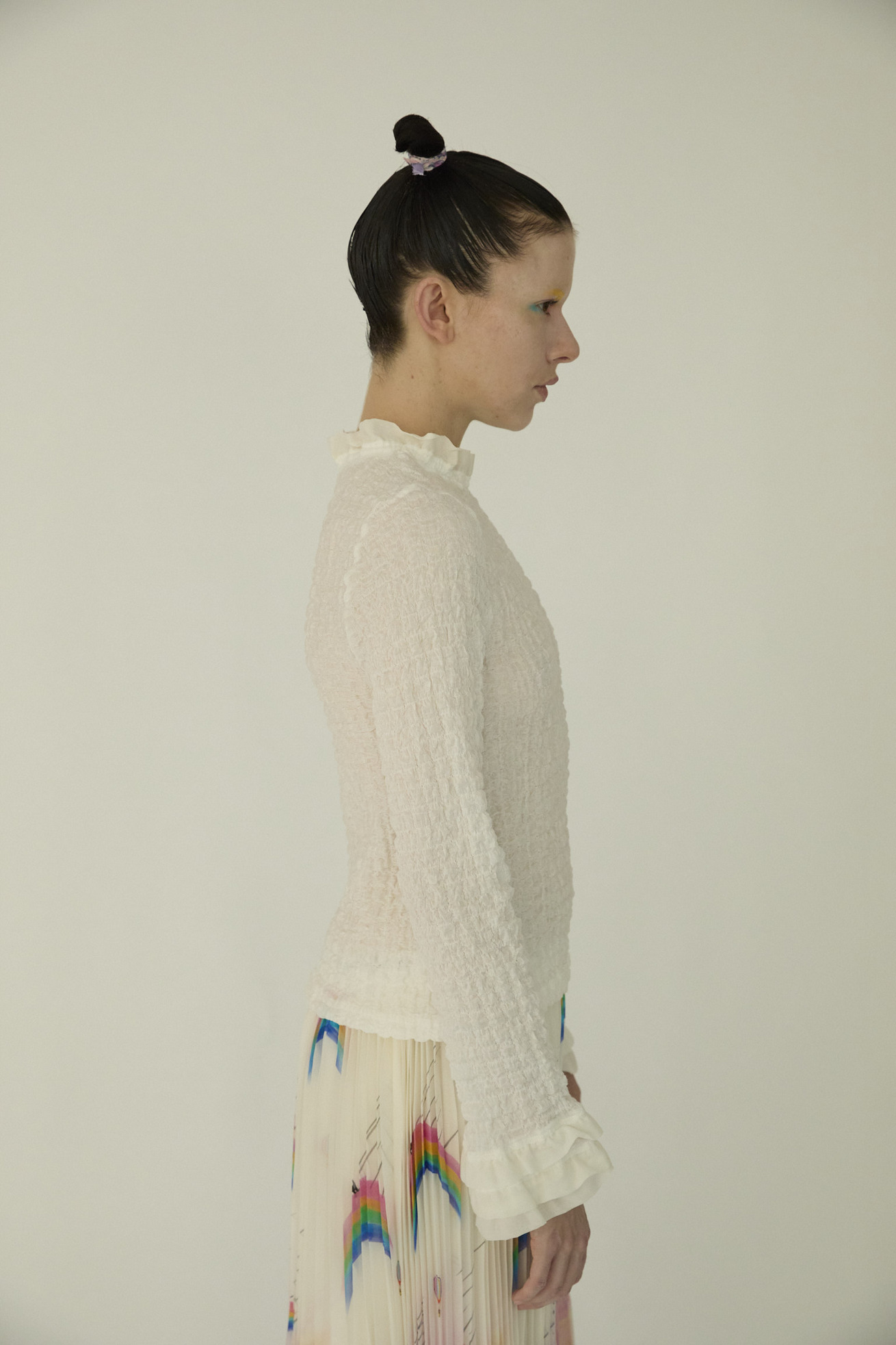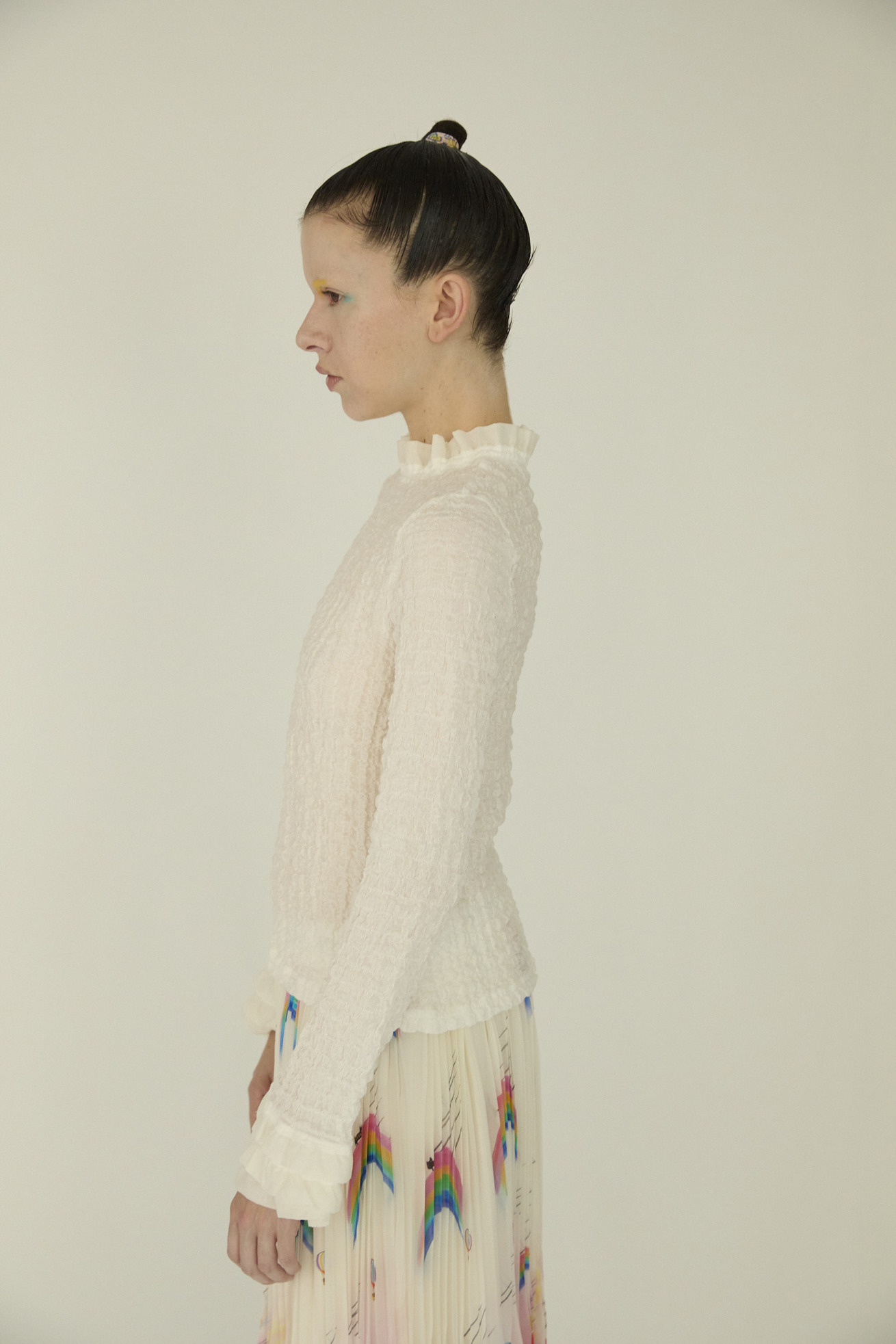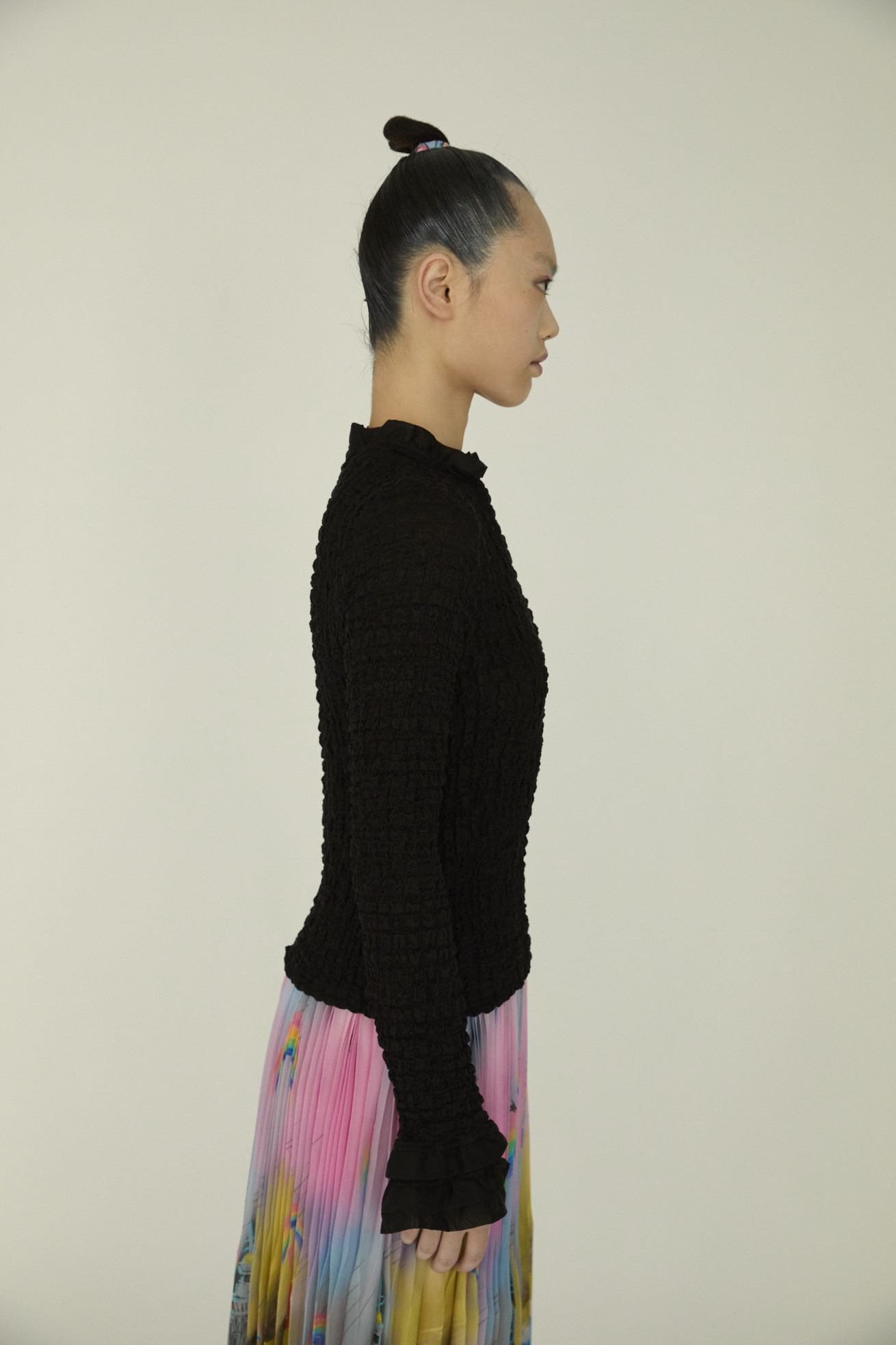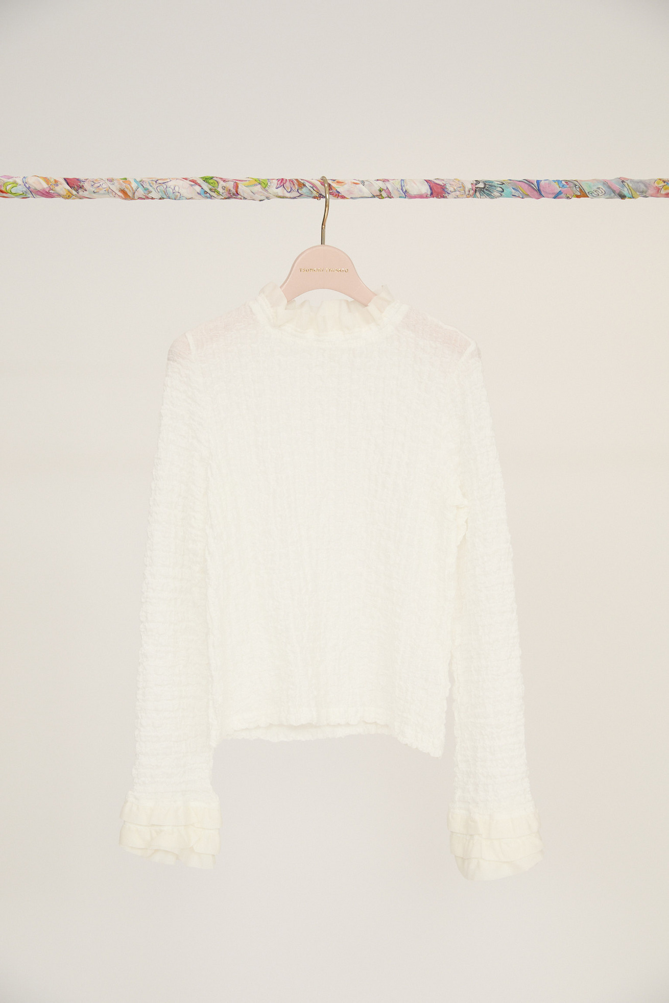 凹凸のある生地感で肌離れが良く、軽い着心地が特徴の長袖トップスです。 ほど良いフィット感のあるコンパクトなサイズ感ながら、体のラインを拾いすぎずインナーとしても1枚でも活躍するアイテムです。 ベース生地は旧式のチェーン機で編み立てたシュリンクレース。 コットンリッチの膨らみのある原料をベースに高い伸縮性を持たせることで、ソフトな着心地にしています。 襟と袖の3段のフリルもアクセントになっています。 ケア方法:手洗い可能 ※着用モデル身長:173cm174cm ※着用サイズ:2(M)