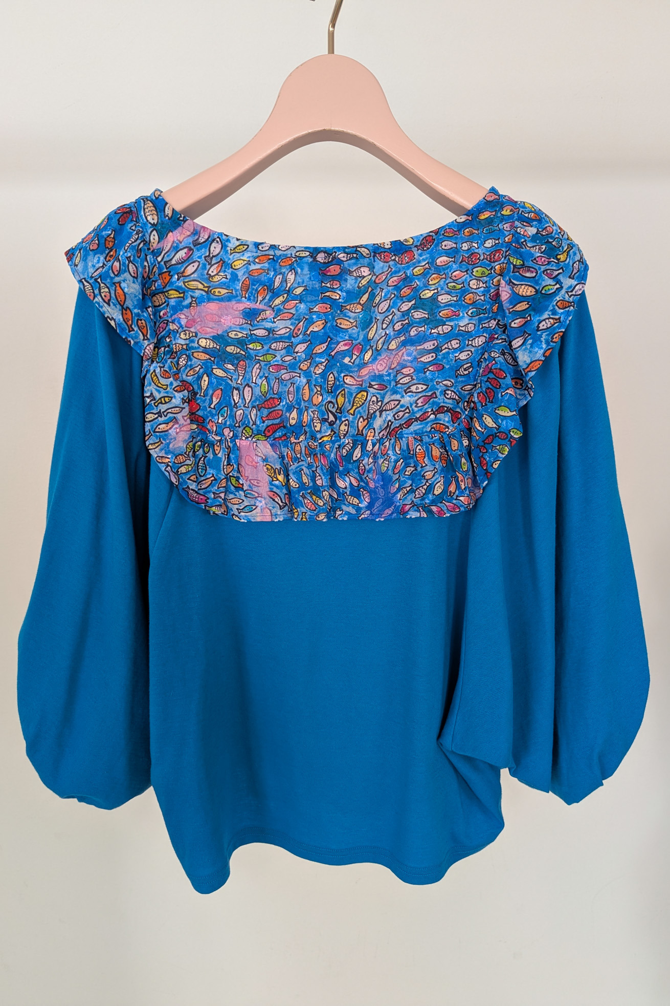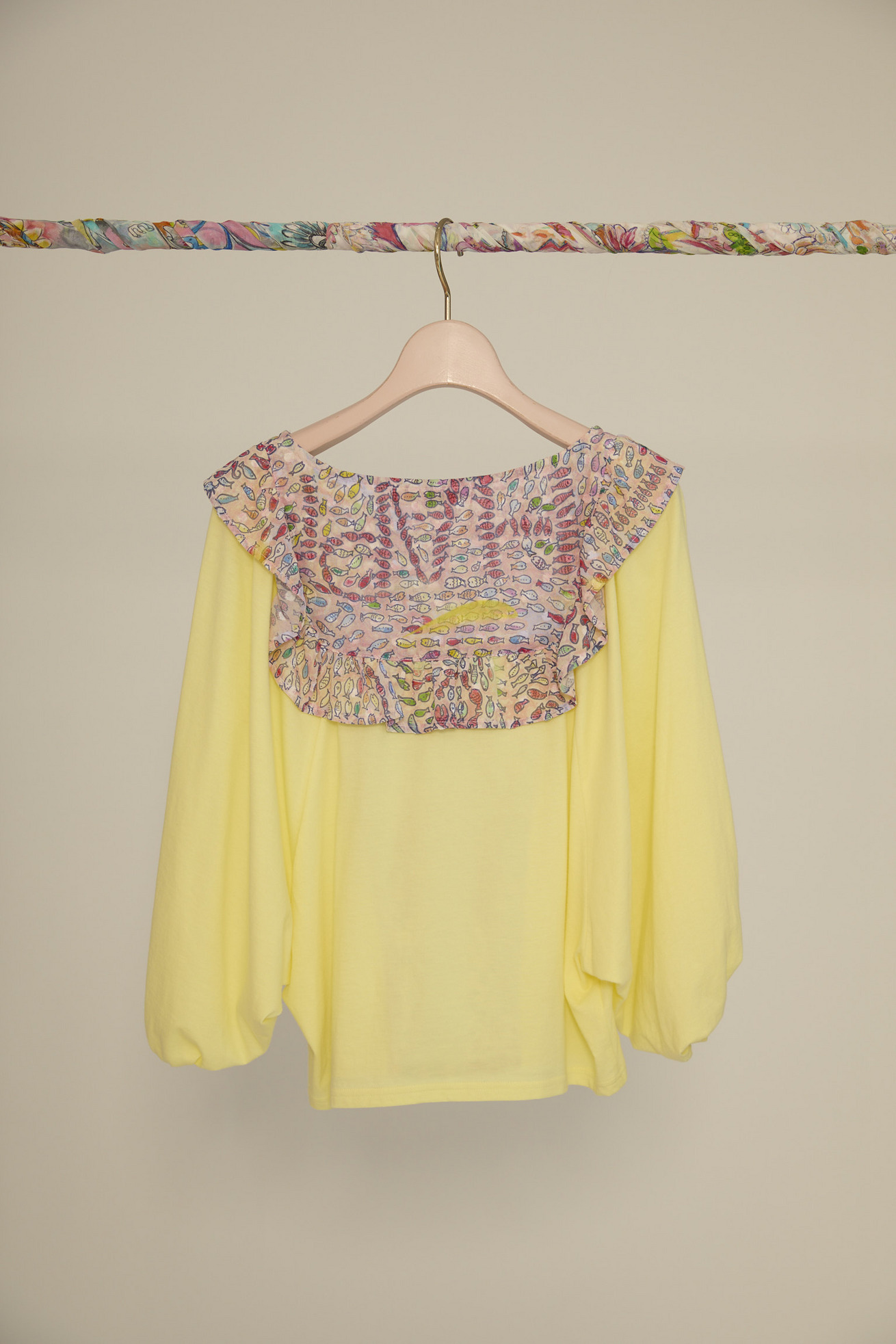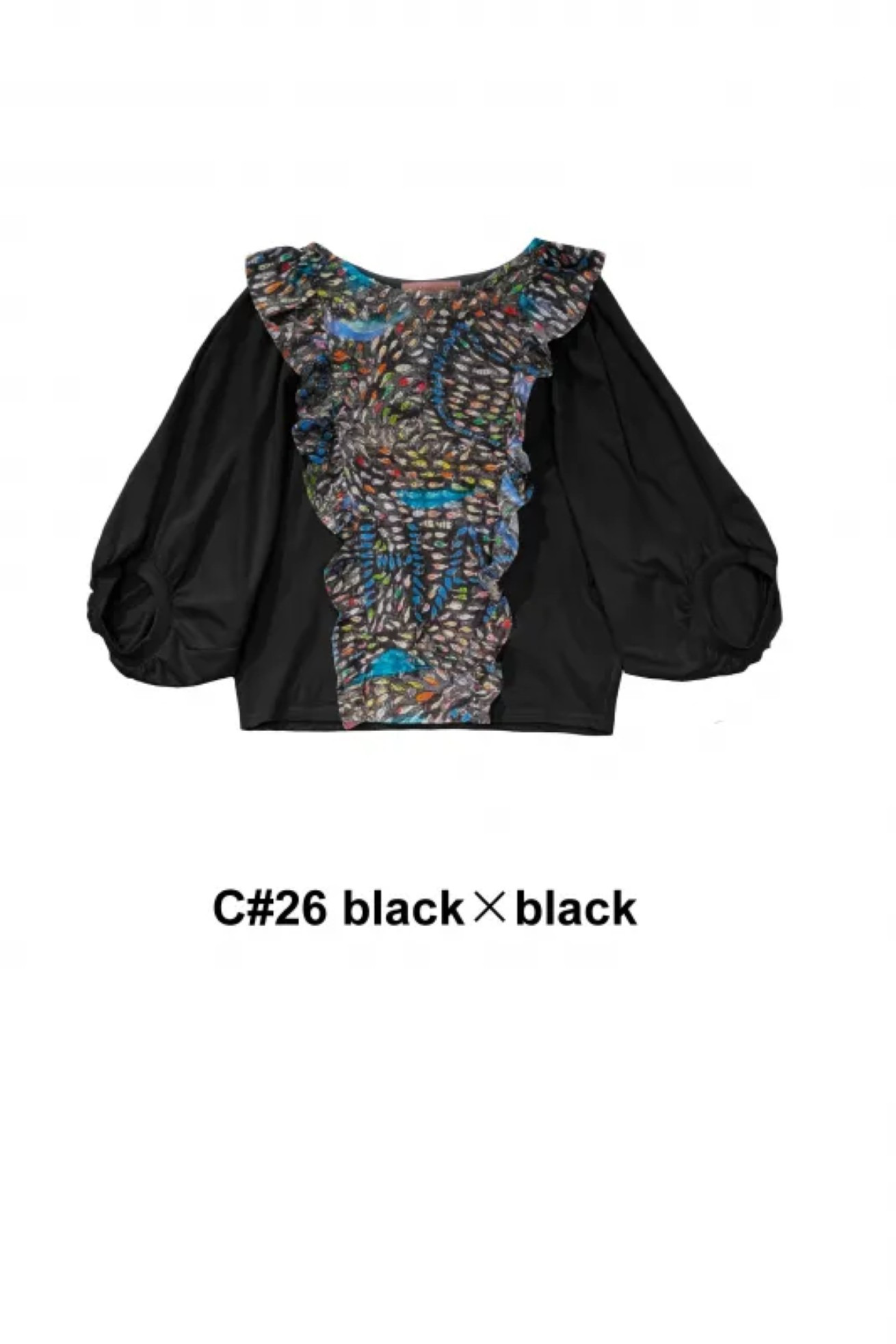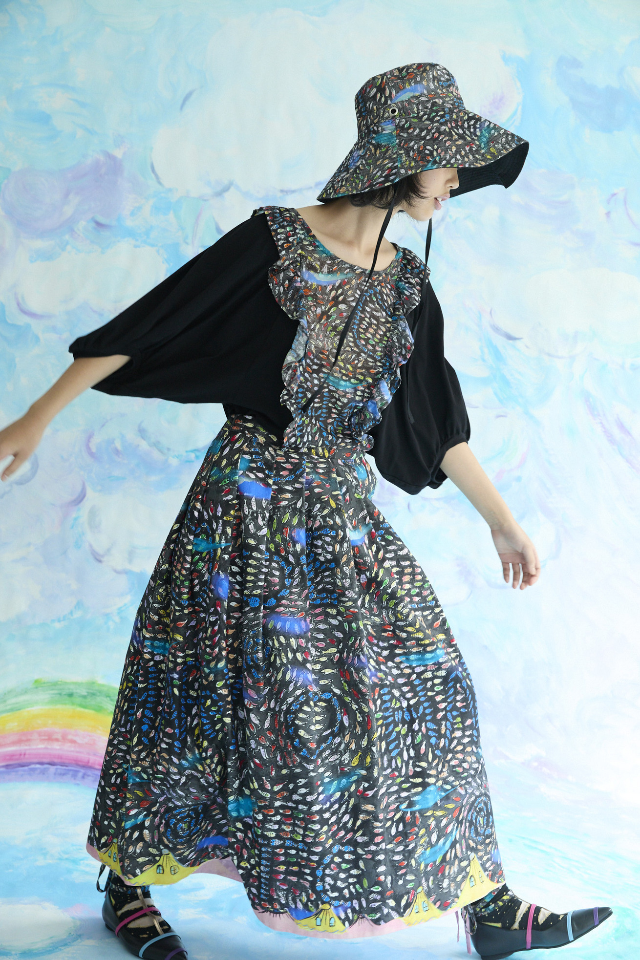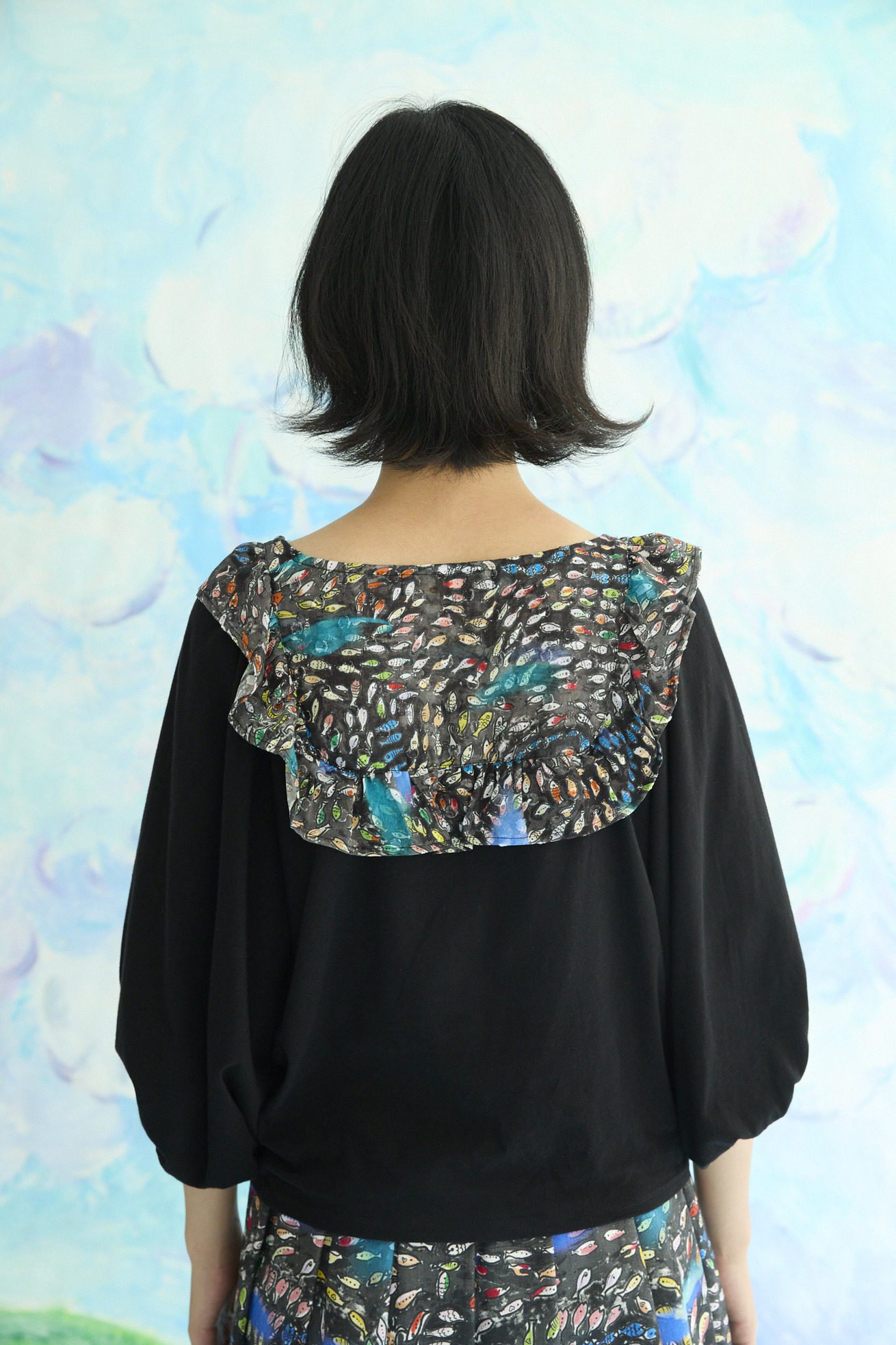前から後ろに繋がるDancing fish paradeの切り替えが特徴的なドルマンスリーブTシャツ。 コンパクトな着丈とボリューム感のある袖のラインがドラマチックな印象のアイテムです。 ベース生地にはなめらかな肌触りの天竺を使用し、柔らかくふくらみのある加工で仕上げています。 【Dancing fish parade】 カラフルな魚たちが踊るように泳ぐ海の中。 小さな魚たちが集まって作るLOVEやHAPPY、ネコ型やハート型が楽しいテキスタイルです。 1匹1匹丁寧なタッチで描かれ、よく見るといろんな表情の魚たちを見つけられる一枚です。カラーコンビネーションにもこだわりました。 少し透け感がある、肌触りの良いコットンの水玉カットジャカード生地に京都でインクジェットプリントをしています。 ケア方法:手洗い可能 ※着用モデル身長:174cm ※着用サイズ: 2(M)
