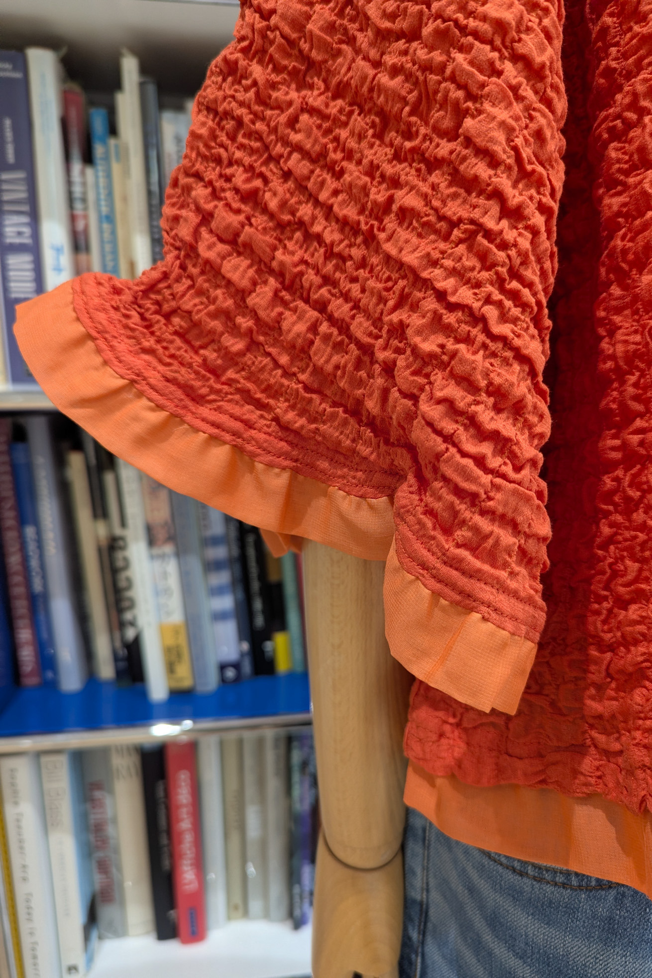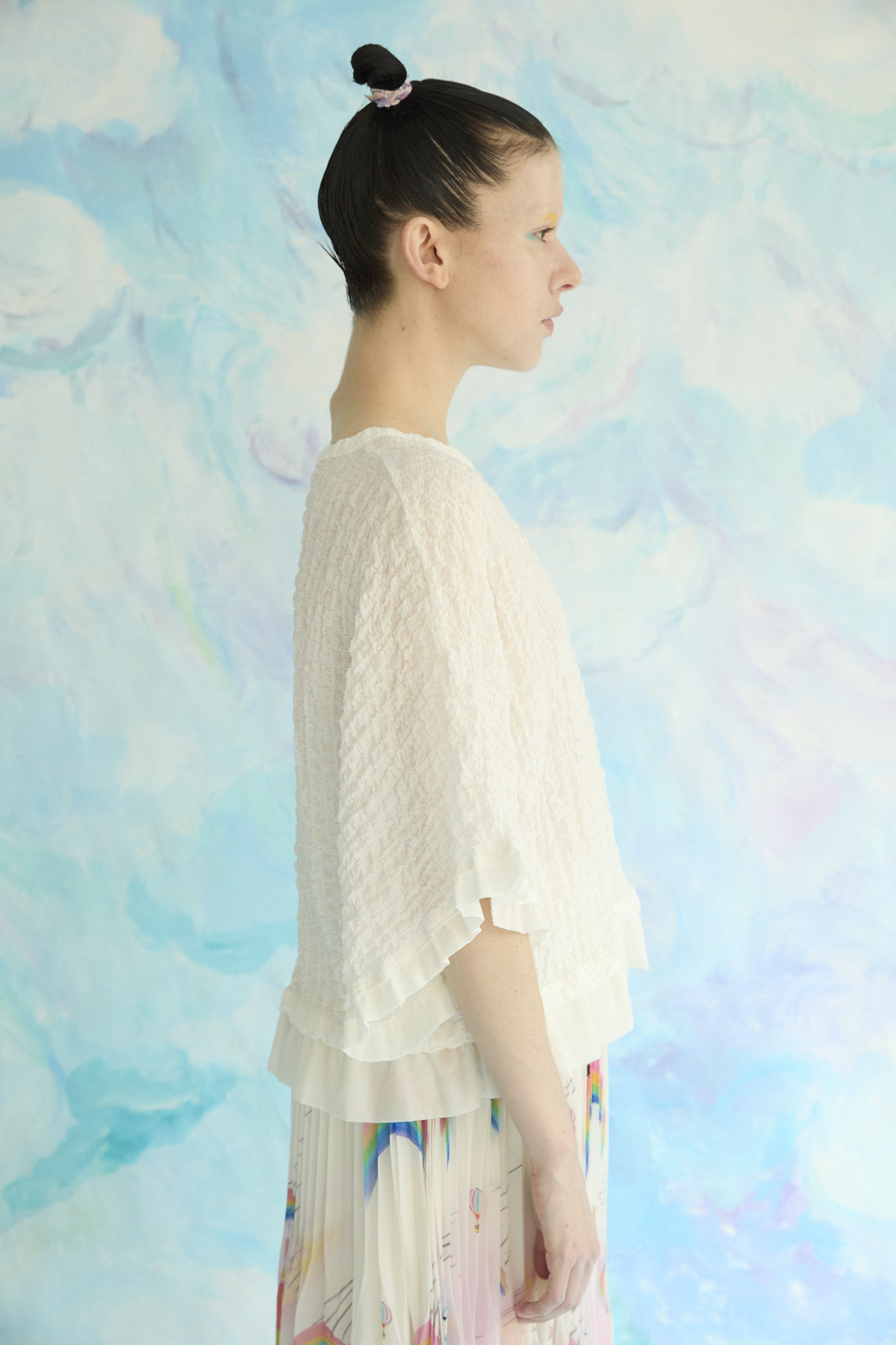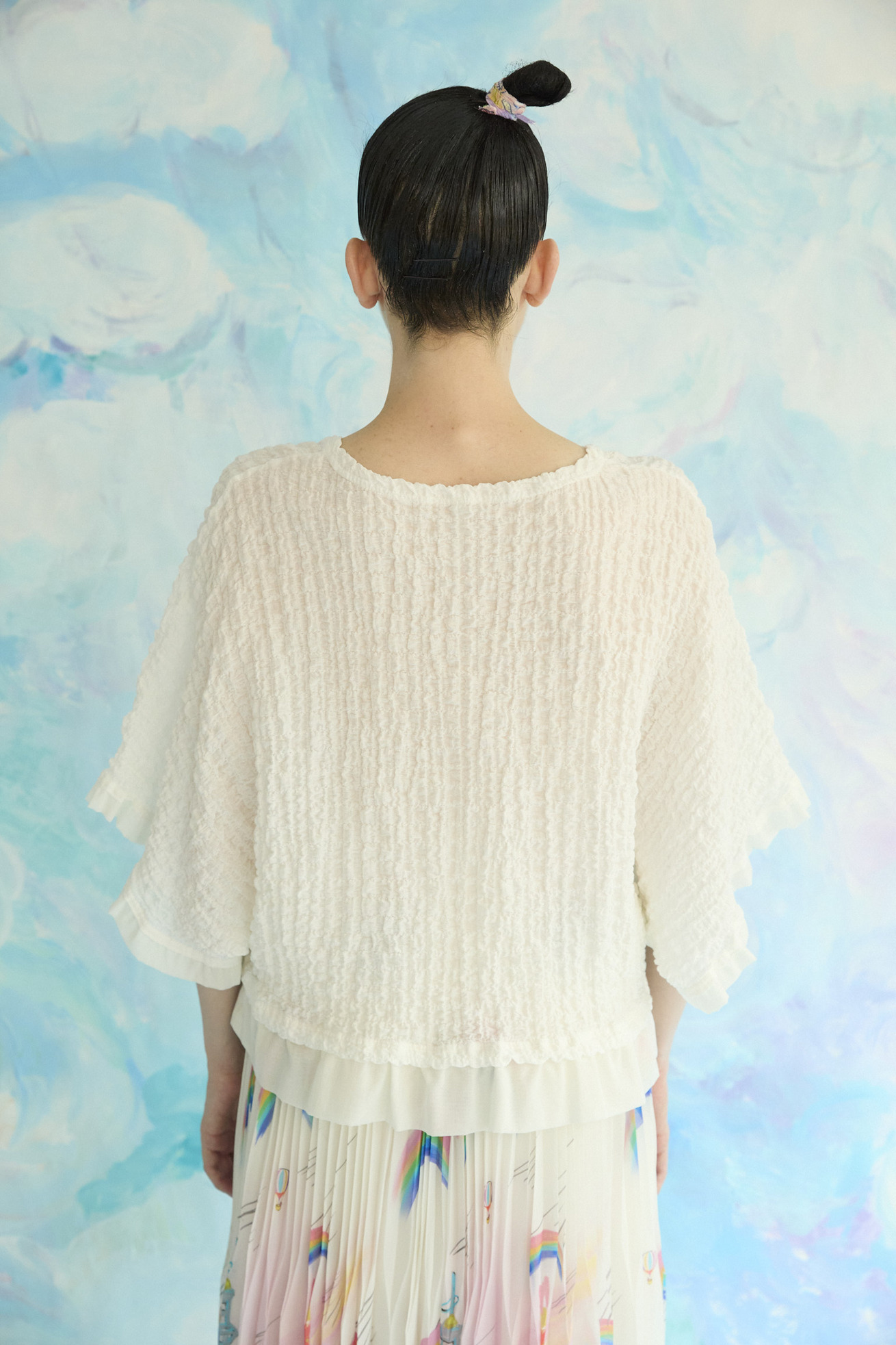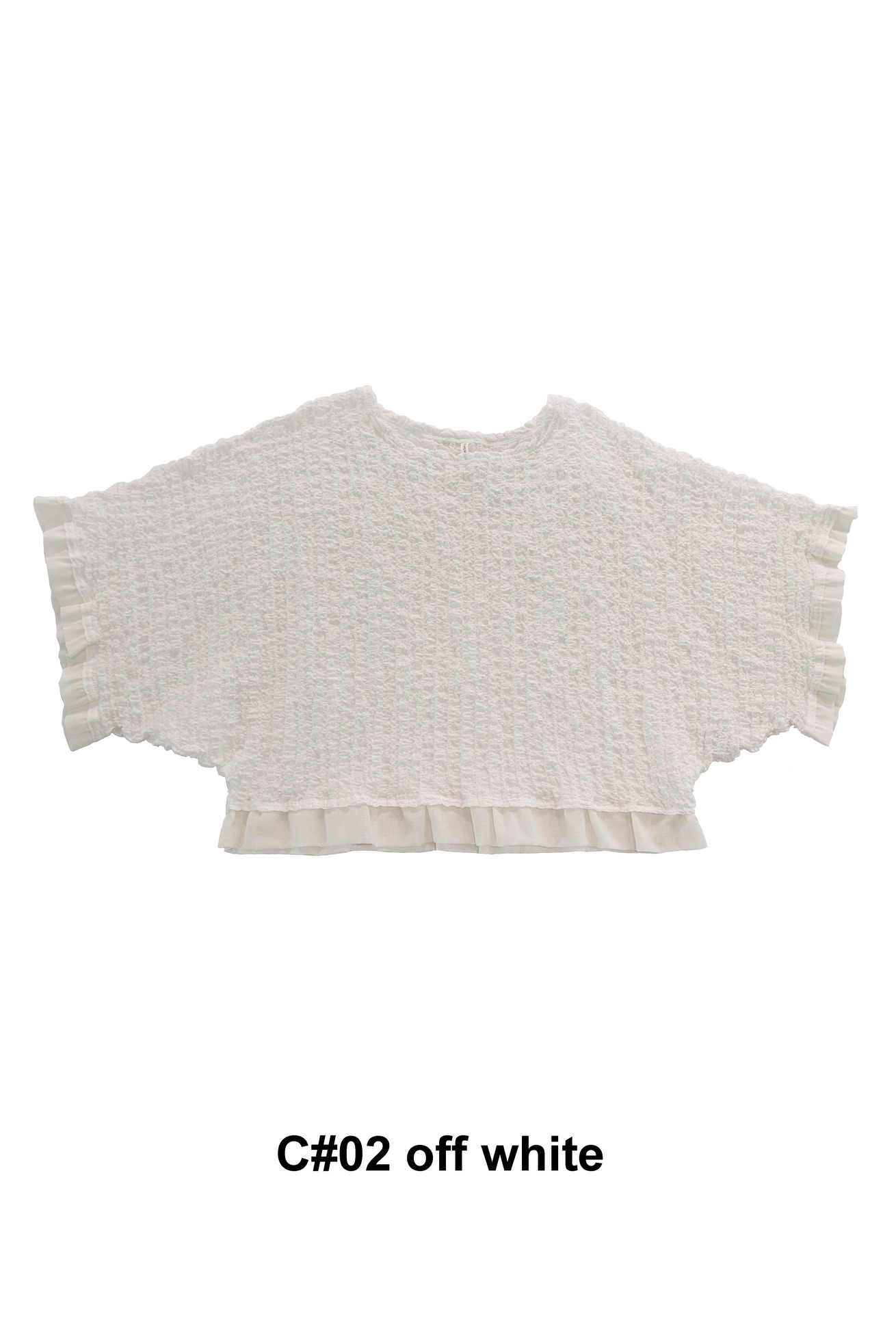 凹凸のある生地感は肌離れが良く、軽い着心地が特徴のドルマンスリーブトップスです。 ベース生地は旧式のチェーン機で編み立てたシュリンクレース。 コットンリッチの膨らみのある原料をベースに高い伸縮性を持たせることで、ソフトな着心地にしています。 身幅はゆったりとしていながら、広がらずおさまりが良く、裾と袖に異素材を合わせているところもポイントです。 ※着用写真の裾のフリルは丈が半分になります。 ケア方法:手洗い可能 ※着用モデル身長:174cm ※着用サイズ:2(M)