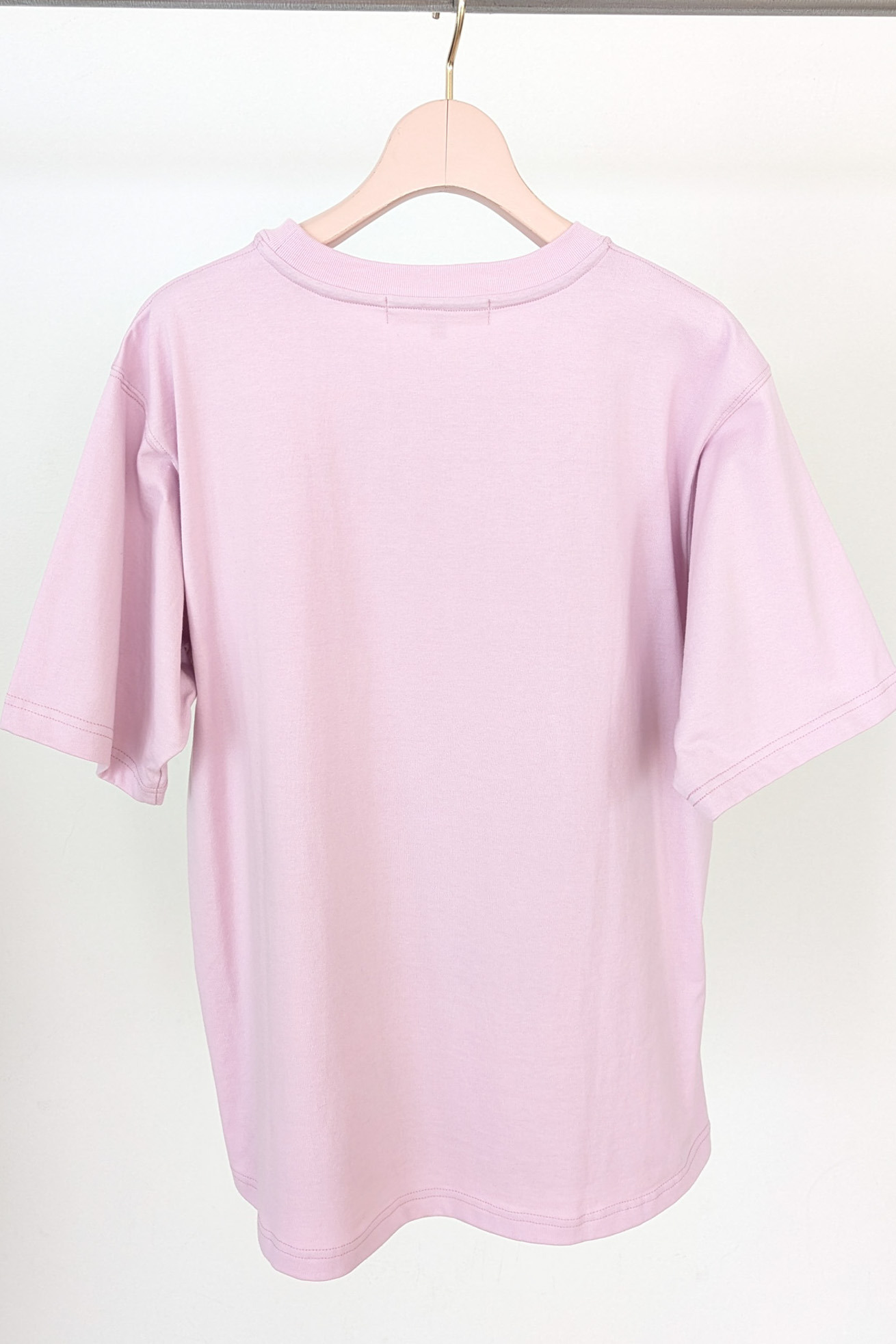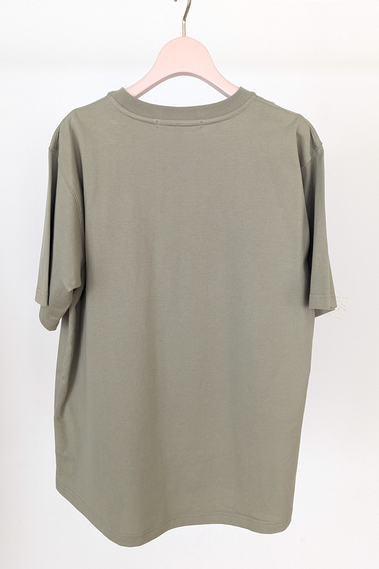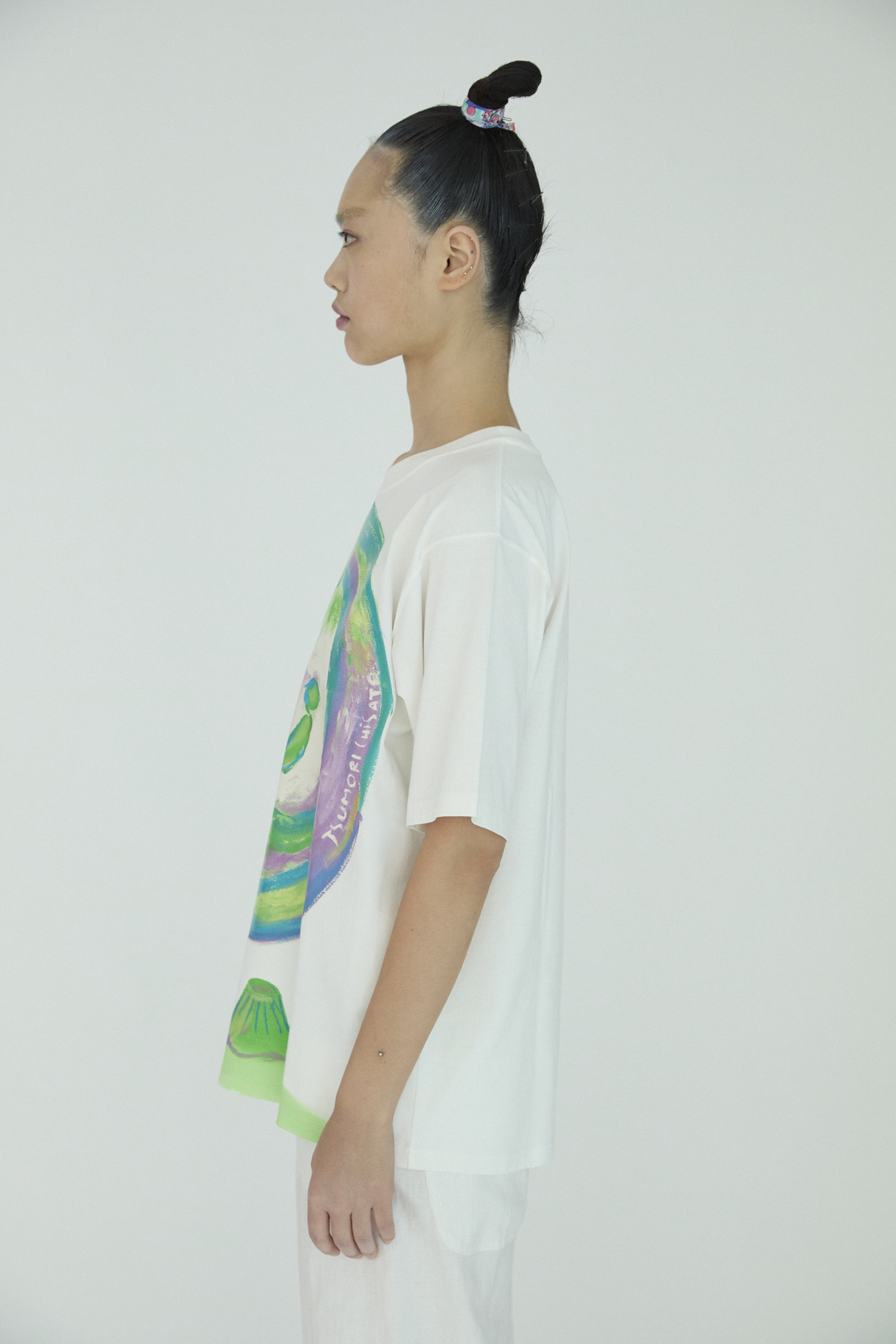 大きな地球のプリントが目を惹く、ベーシックな形の半袖Tシャツ。 どこかの惑星から見た地球をイメージしたプリントは、混ざり合う色や筆のタッチをそのまま、シルクスクリーンのハンドプリントで表現しています。 部分的に表面に艶を出す加工をし、京都でプリントしました。 ベースの生地は膨らみがあり、しっかりとした生地感の天竺素材を使用しています。 ケア方法:手洗い可能 ※着用モデル身長:174cm ※着用サイズ:2(M)