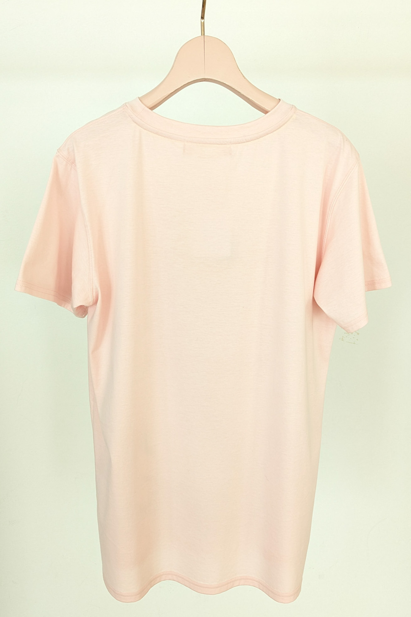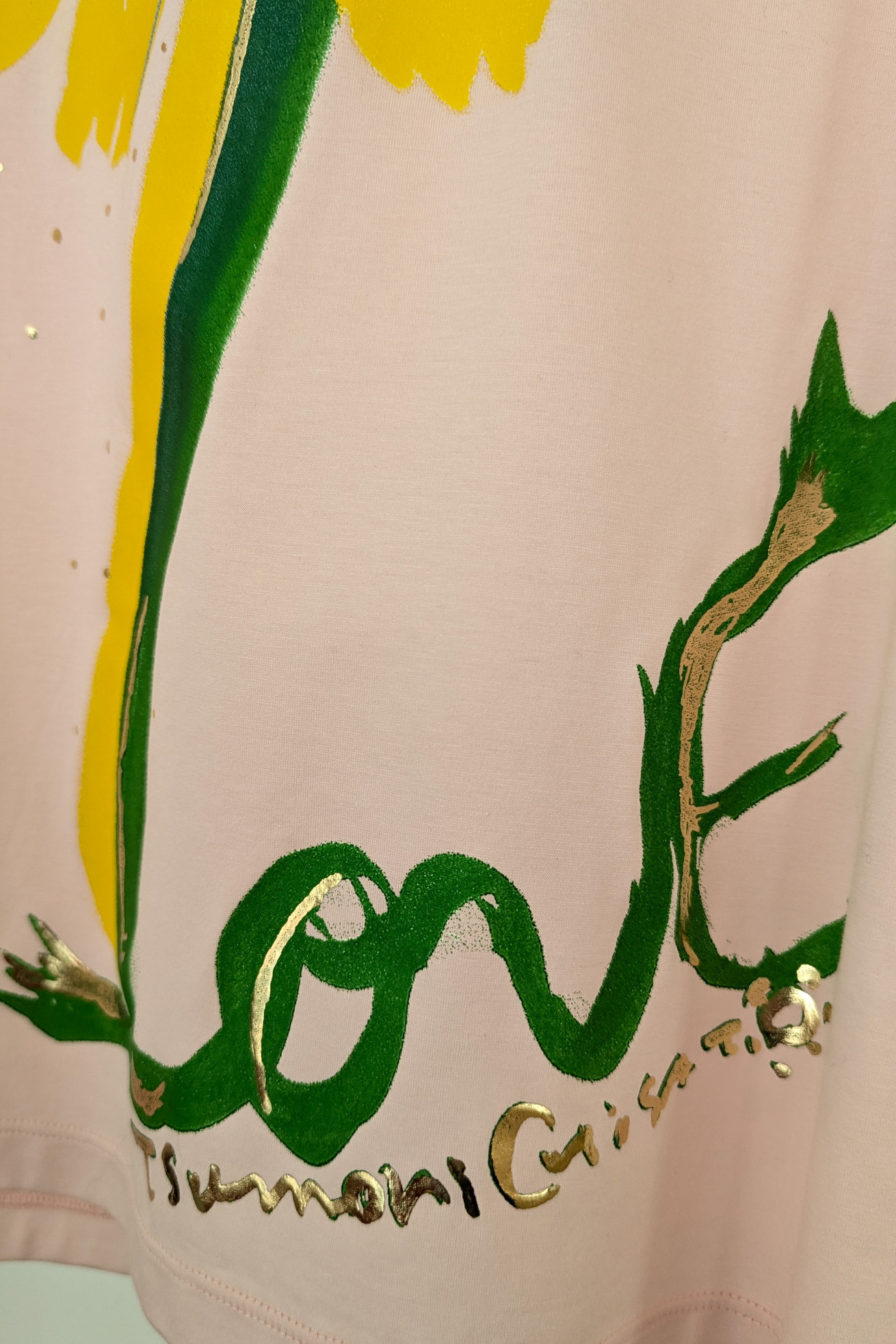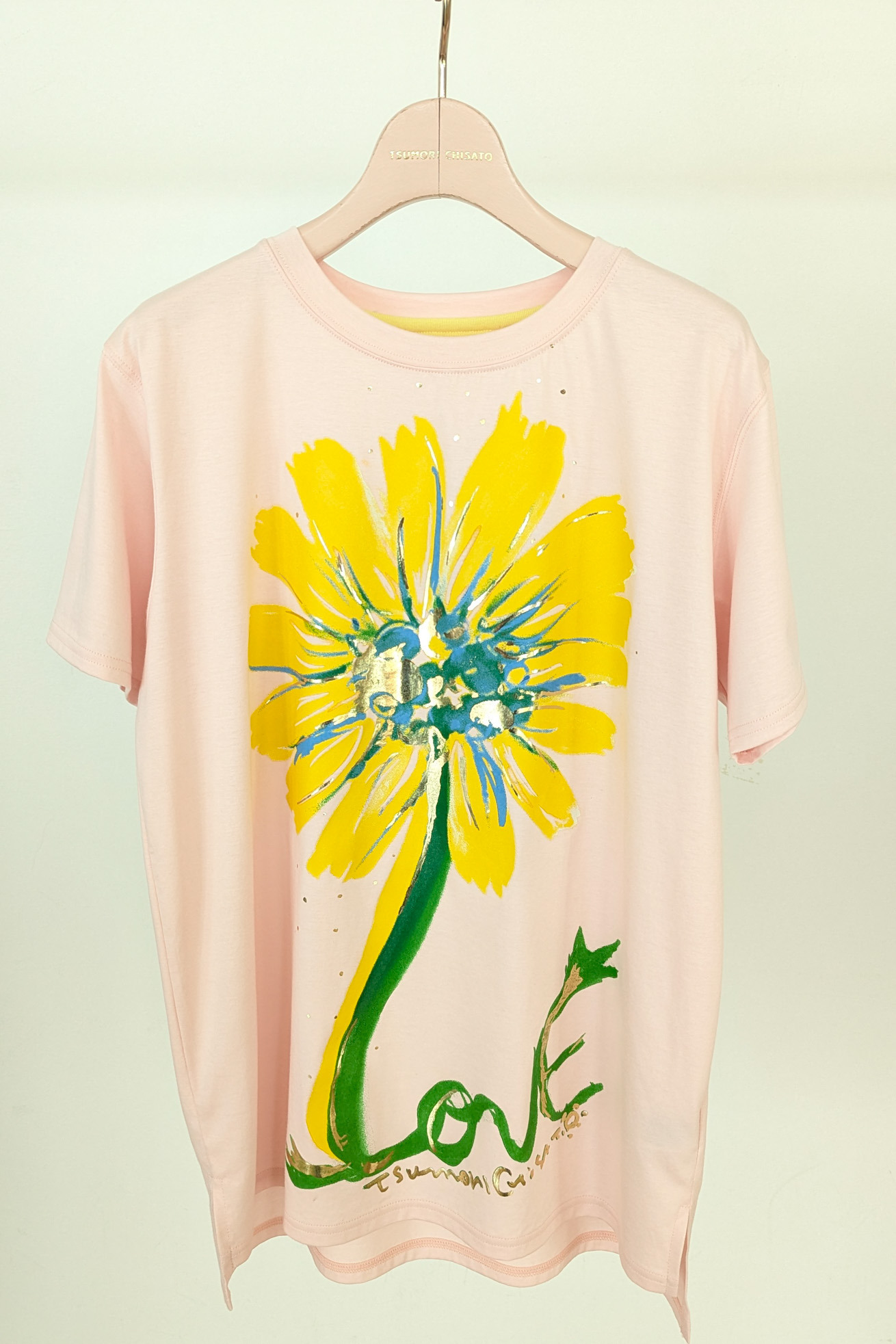 葉っぱ部分がLoveの文字になったダイナミックなデイジーが存在感のある半袖Tシャツ。 箔プリントと、全体に少し厚みを持たせたプリントがポイントで、京都でハンドプリントをしています。 接触冷感性があり、毛羽が少なくシルクのような光沢のコットン天竺を使用し、なめらかで着心地の良いアイテムに仕上げました。 ベーシックなデザインで暑い夏に1枚で着やすいアイテムです。両サイドにスリット入り。 ケア方法:手洗い可能 ※着用モデル身長:173cm ※着用サイズ: 2(M)