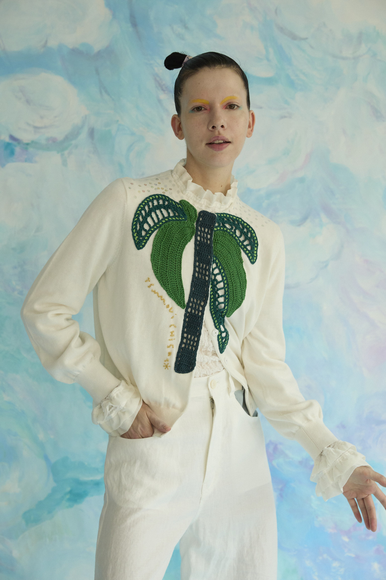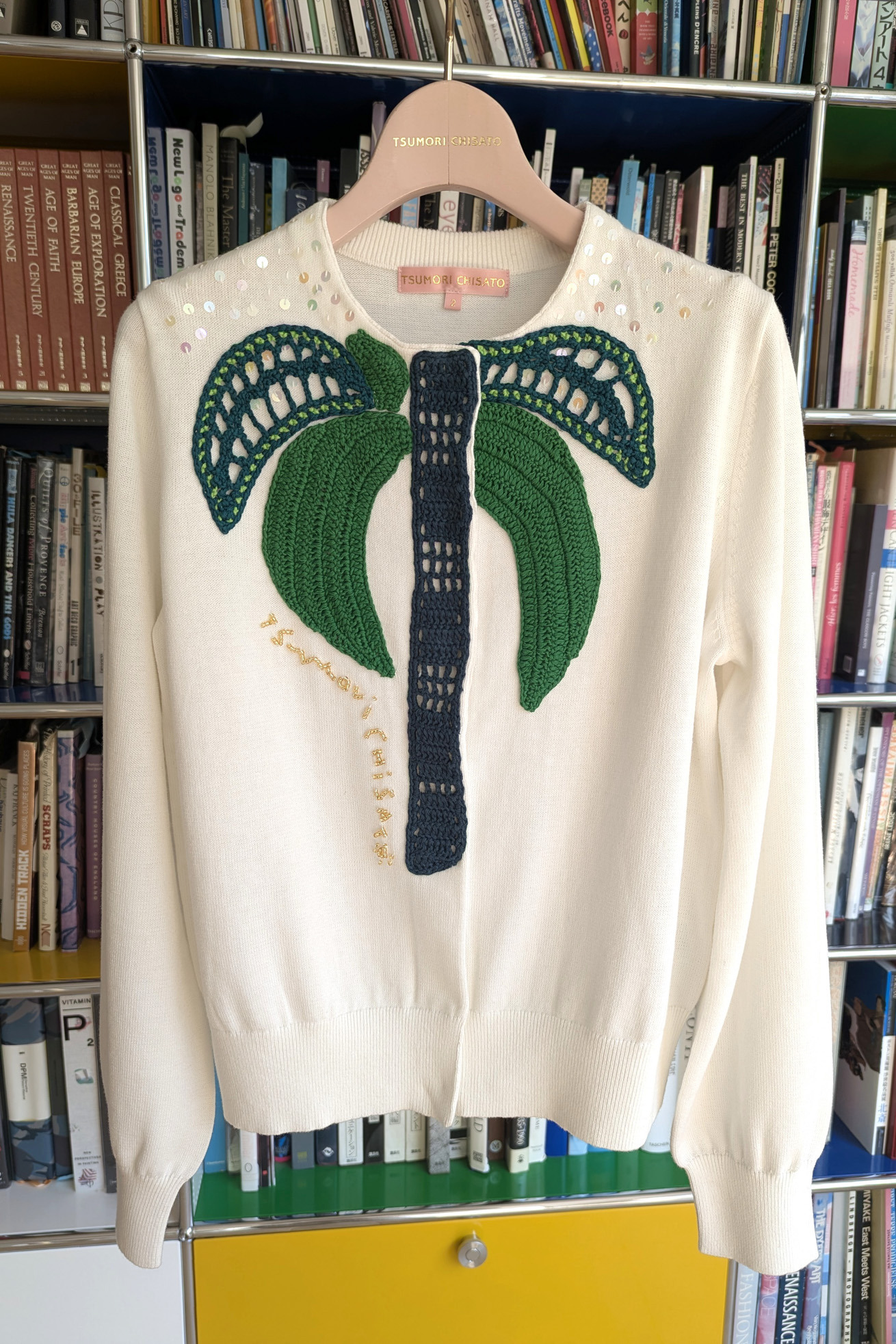 大きなヤシの木を刺繍で表現したコンパクト丈のニットカーディガン。 ベーシックな形で着回しやすいアイテムです。 スナップ釦を留めてトップスとしても活躍します。 スパンコールやビーズ刺繍のロゴがキラキラと華やかさをプラスしています。 ケア方法:ドライクリーニング ※着用モデル身長:173cm ※着用サイズ: 2(M)