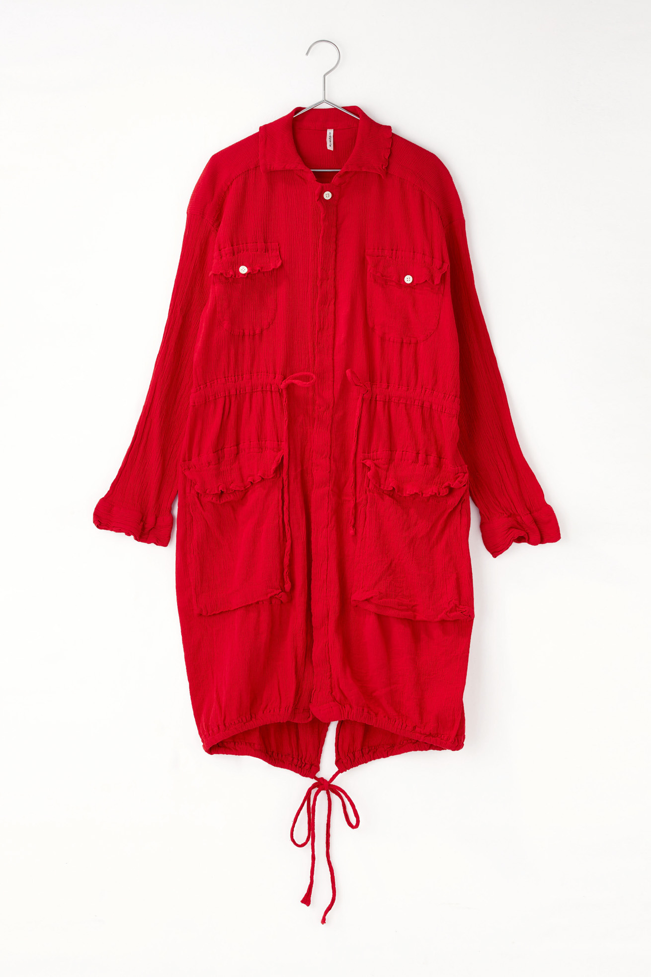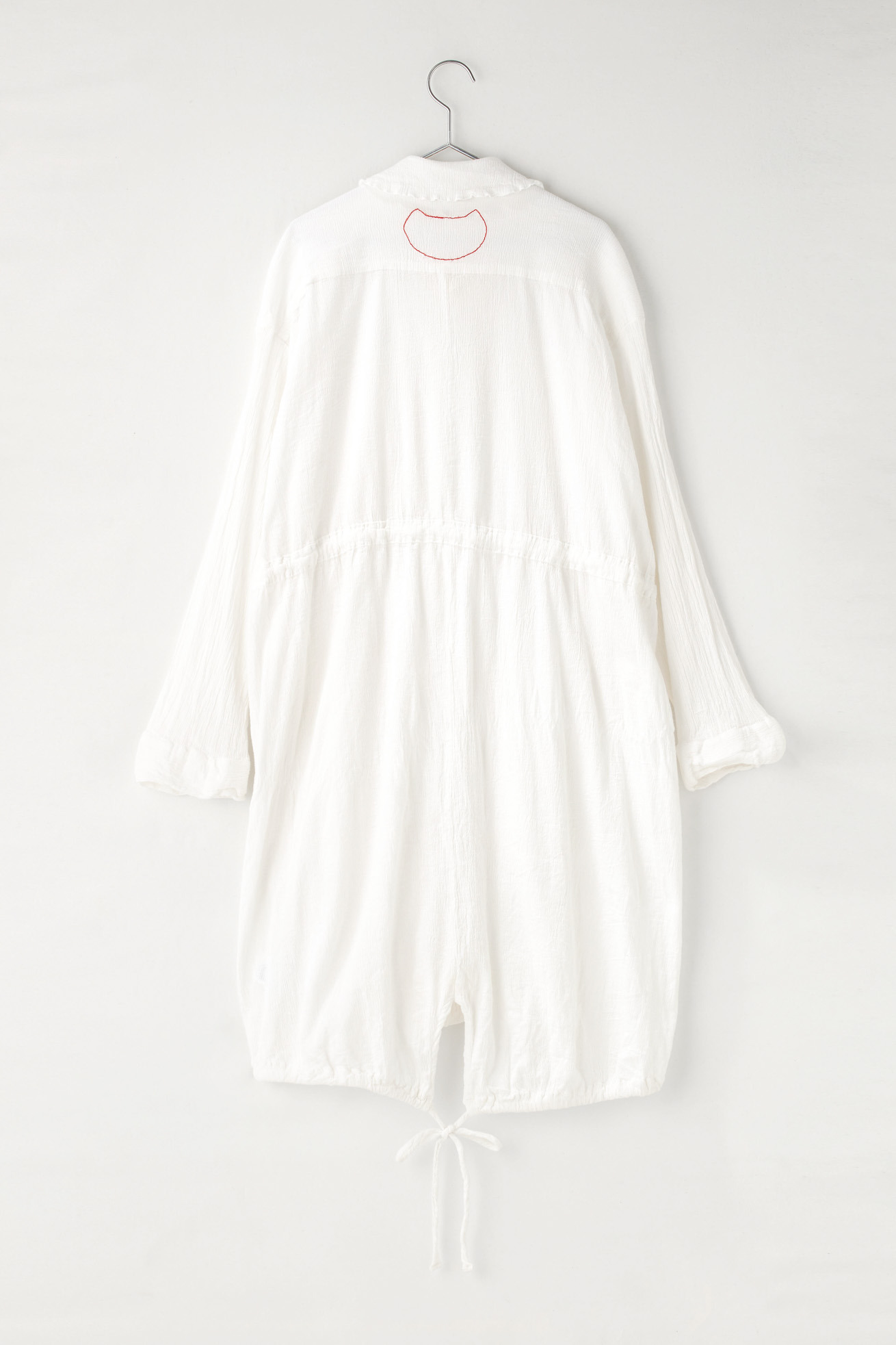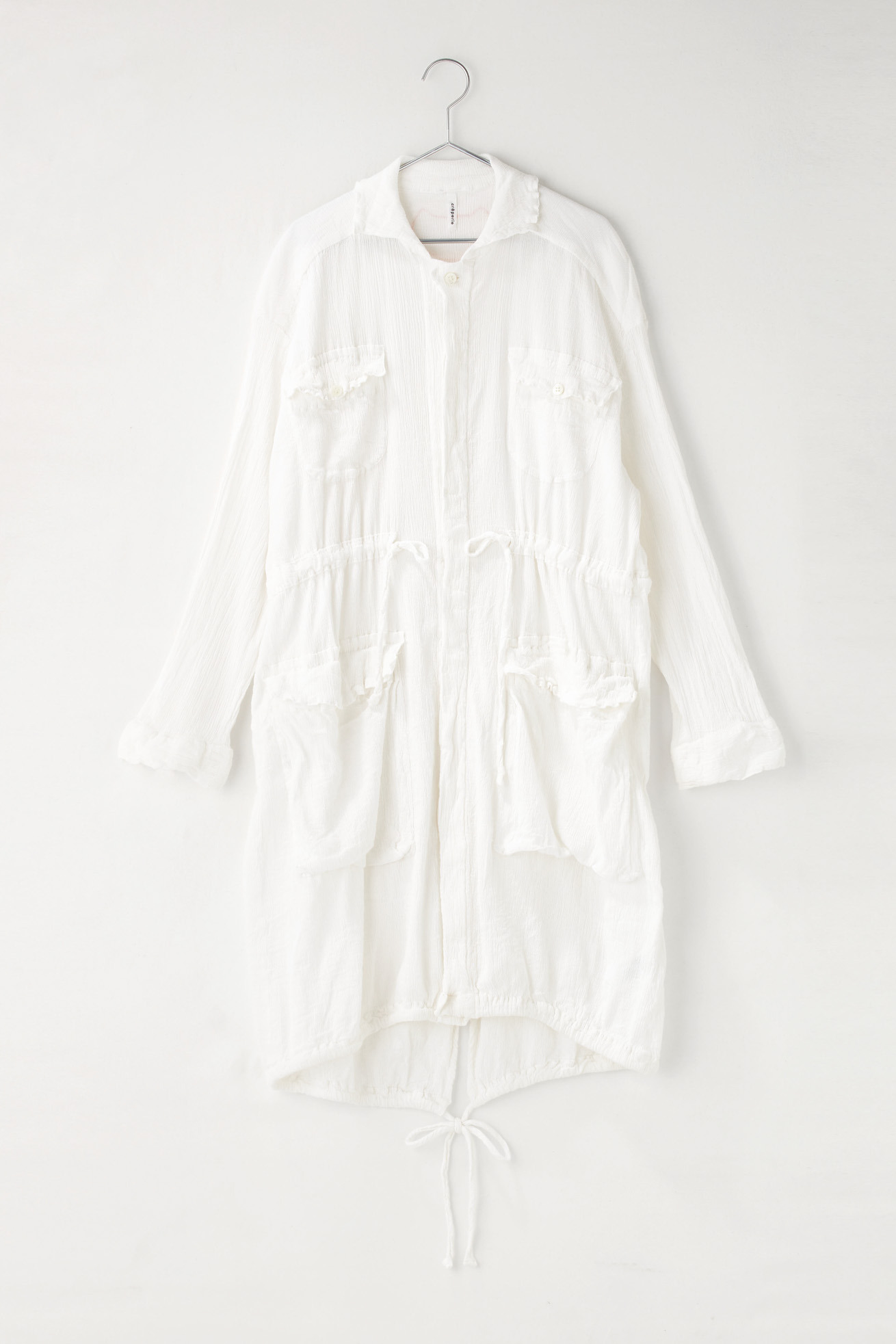 2024SSの新しく登場したモッズコート風のシャツワンピースです。 ウエスト、裾には共地の紐を通し、羽織としても形のキレイなアイテムです。 羽織として、デニムパンツやワンピースとのコーディネートにも合い、1日の中で温度差のあるこれからの季節にぴったりのアイテムです。 生地の織りは、古くからちりめんで有名な滋賀県高島地区、染めと仕上げは岐阜県大垣市にて行っています。 crêperie(クレプリ)とは・・・ 1994年に発表した、コットン素材のシボ感が特徴的なアイテムです。 国内の工場、職人さんの高い技術によって作られる生地は、伸縮性が非常に高く、程よいフィット感で一度着るとクセになる着心地です。 染色後に自然乾燥をし、時間をかけて丁寧に作られます。 ネットに入れて洗濯機で洗えるイージーケアも特徴です。 シワを気にせずコンパクトにたためるので、ご旅行や室内での温度調整など、持ち運びに便利なアイテムです。 ※サイズについて 商品により個体差がございます。予めご了承ください。
