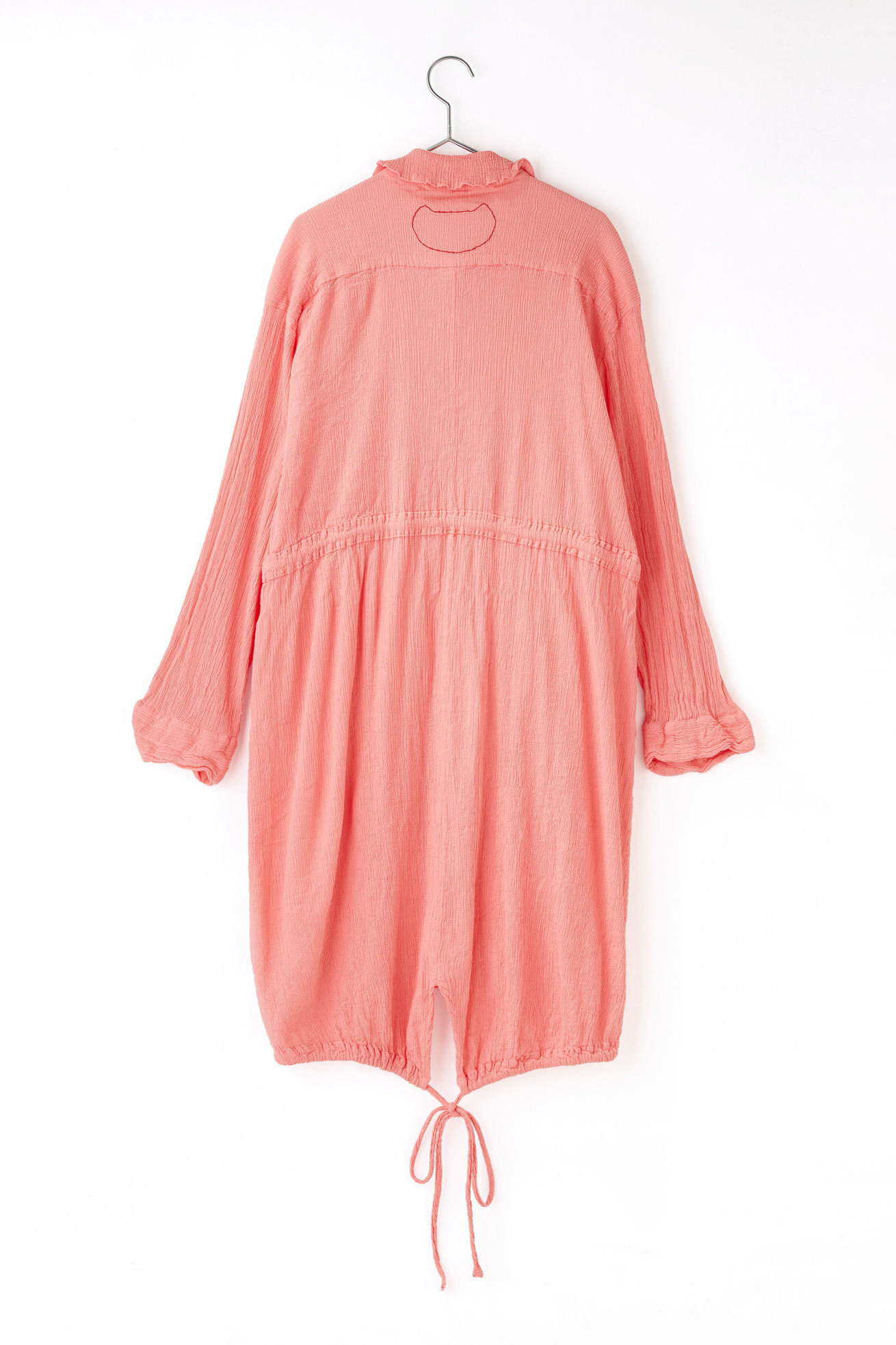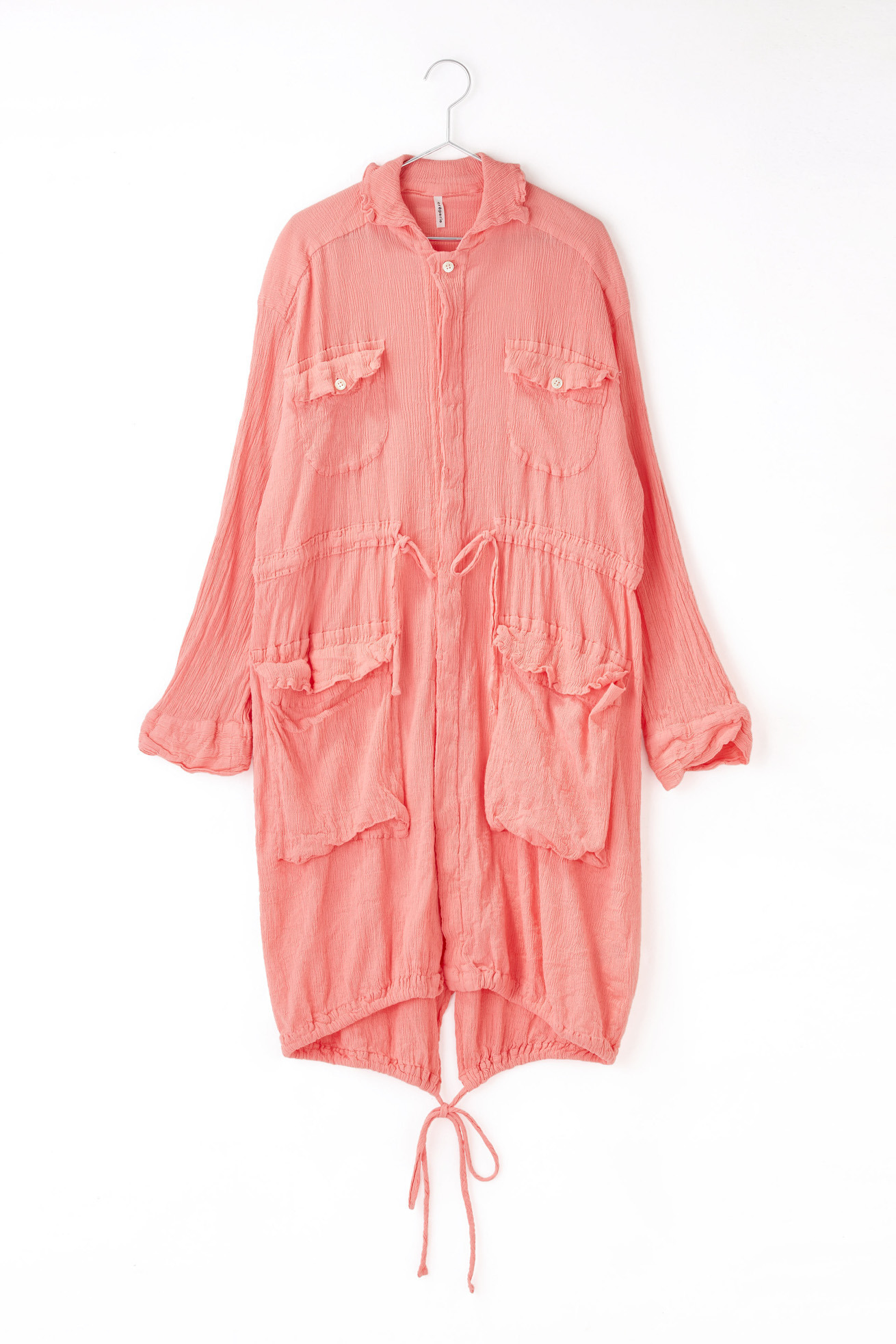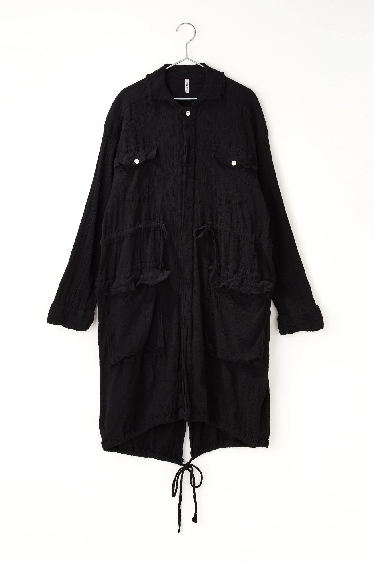 2024SSの新しく登場したモッズコート風のシャツワンピースです。 ウエスト、裾には共地の紐を通し、羽織としても形のキレイなアイテムです。 羽織として、デニムパンツやワンピースとのコーディネートにも合い、1日の中で温度差のあるこれからの季節にぴったりのアイテムです。 生地の織りは、古くからちりめんで有名な滋賀県高島地区、染めと仕上げは岐阜県大垣市にて行っています。 crêperie(クレプリ)とは・・・ 1994年に発表した、コットン素材のシボ感が特徴的なアイテムです。 国内の工場、職人さんの高い技術によって作られる生地は、伸縮性が非常に高く、程よいフィット感で一度着るとクセになる着心地です。 染色後に自然乾燥をし、時間をかけて丁寧に作られます。 ネットに入れて洗濯機で洗えるイージーケアも特徴です。 シワを気にせずコンパクトにたためるので、ご旅行や室内での温度調整など、持ち運びに便利なアイテムです。 ※サイズについて 商品により個体差がございます。予めご了承ください。